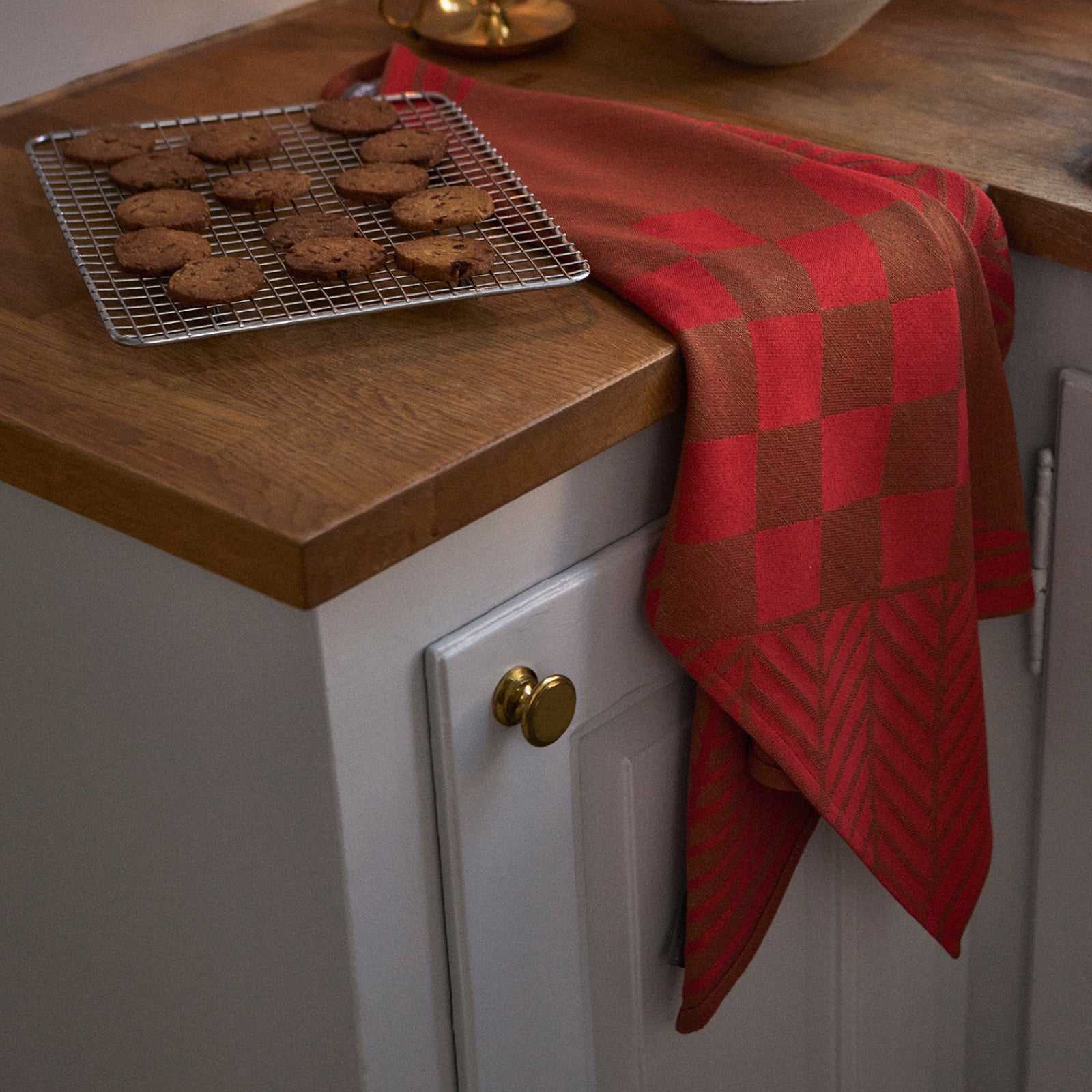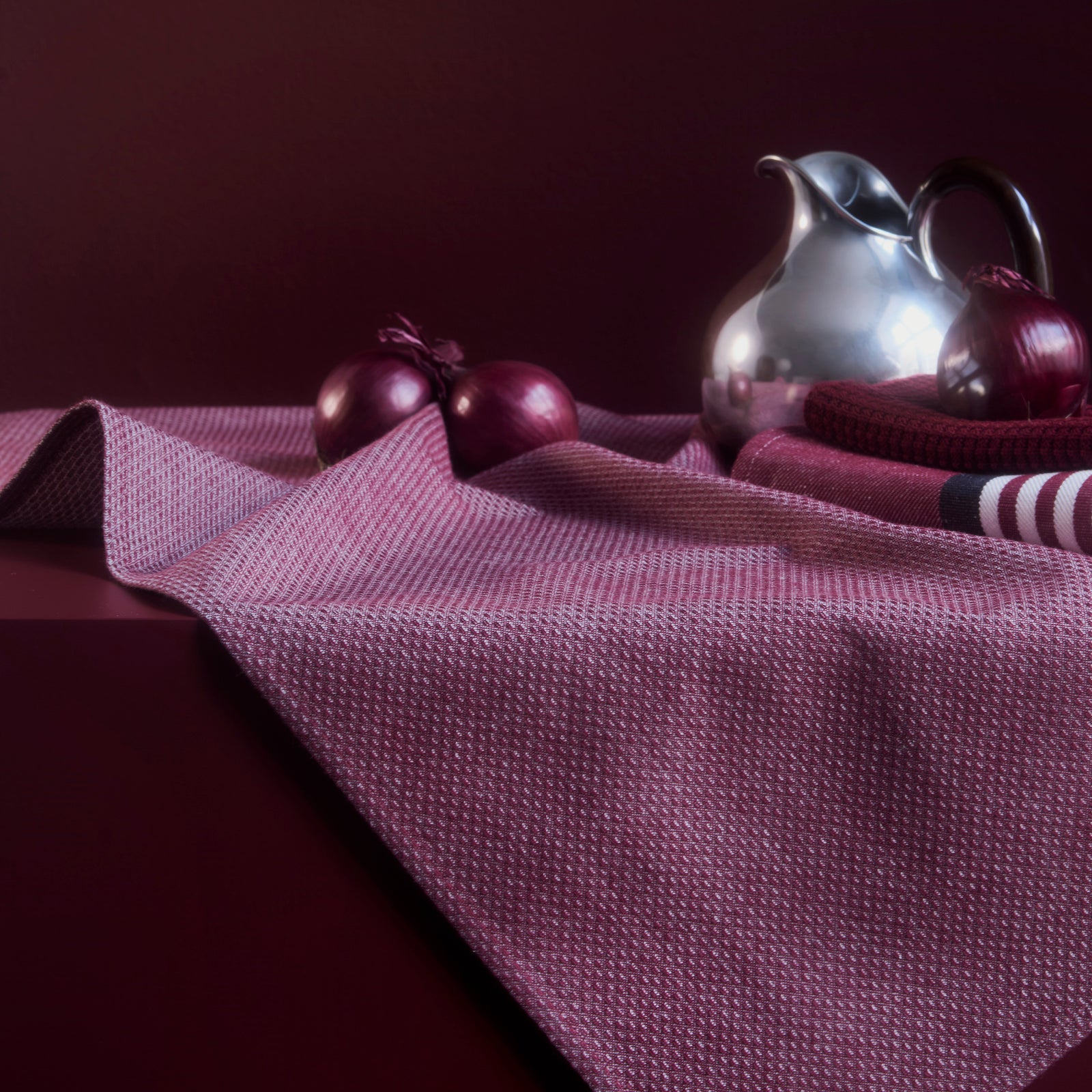 Klassiska kökstextilier i Carmine Red – en djup och distingerad röd färg.