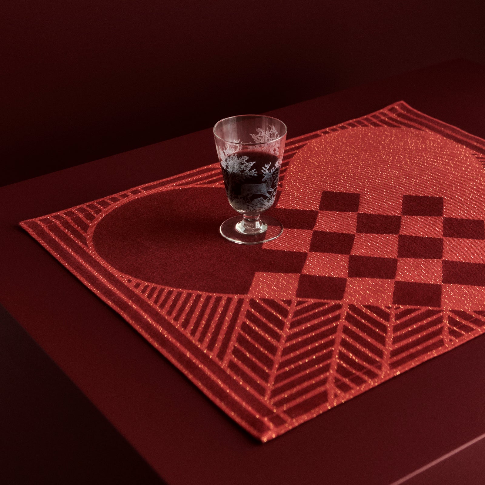 I anledning av juldesignets 50-årsjubileum har julbordstabletten fått en ny, gnistrande touch med gyllene, metalliska trådar vävda in i den delikata mörkröda bomullen.