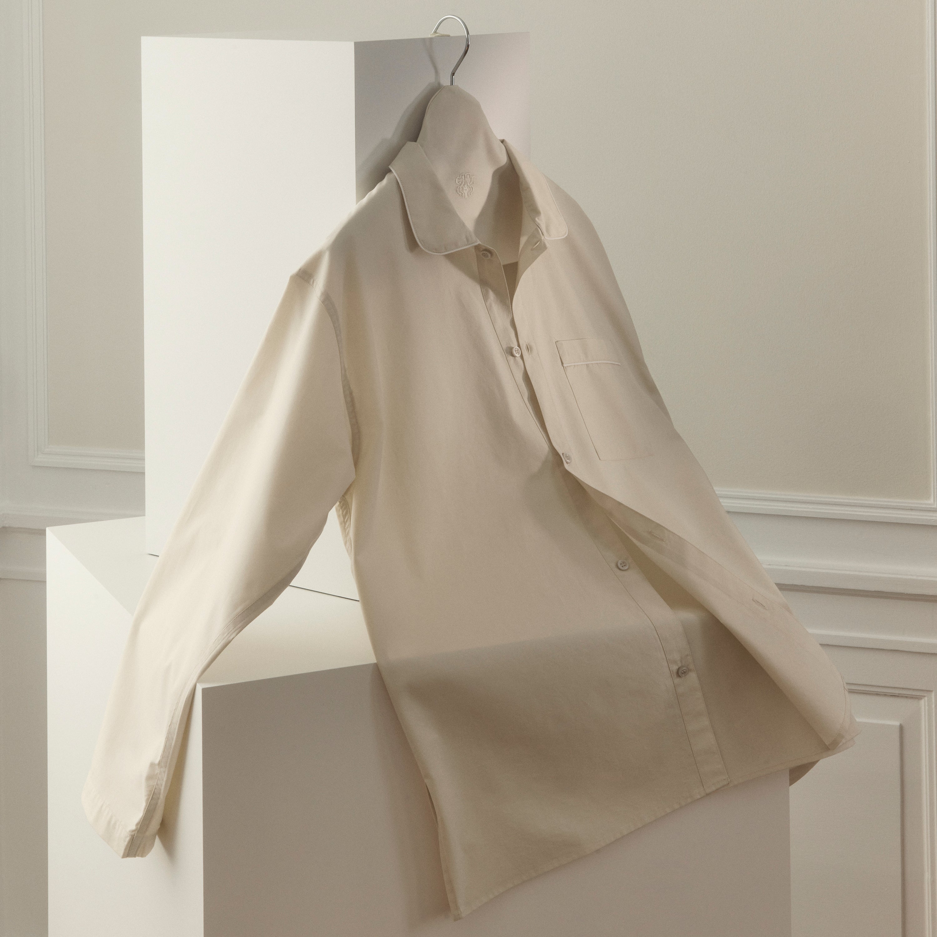 Percalevävd pyjamas med klassisk skärning och eleganta detaljer, såsom sidospjäll, bröstficka, rundad krage och vita pipingdetaljer.