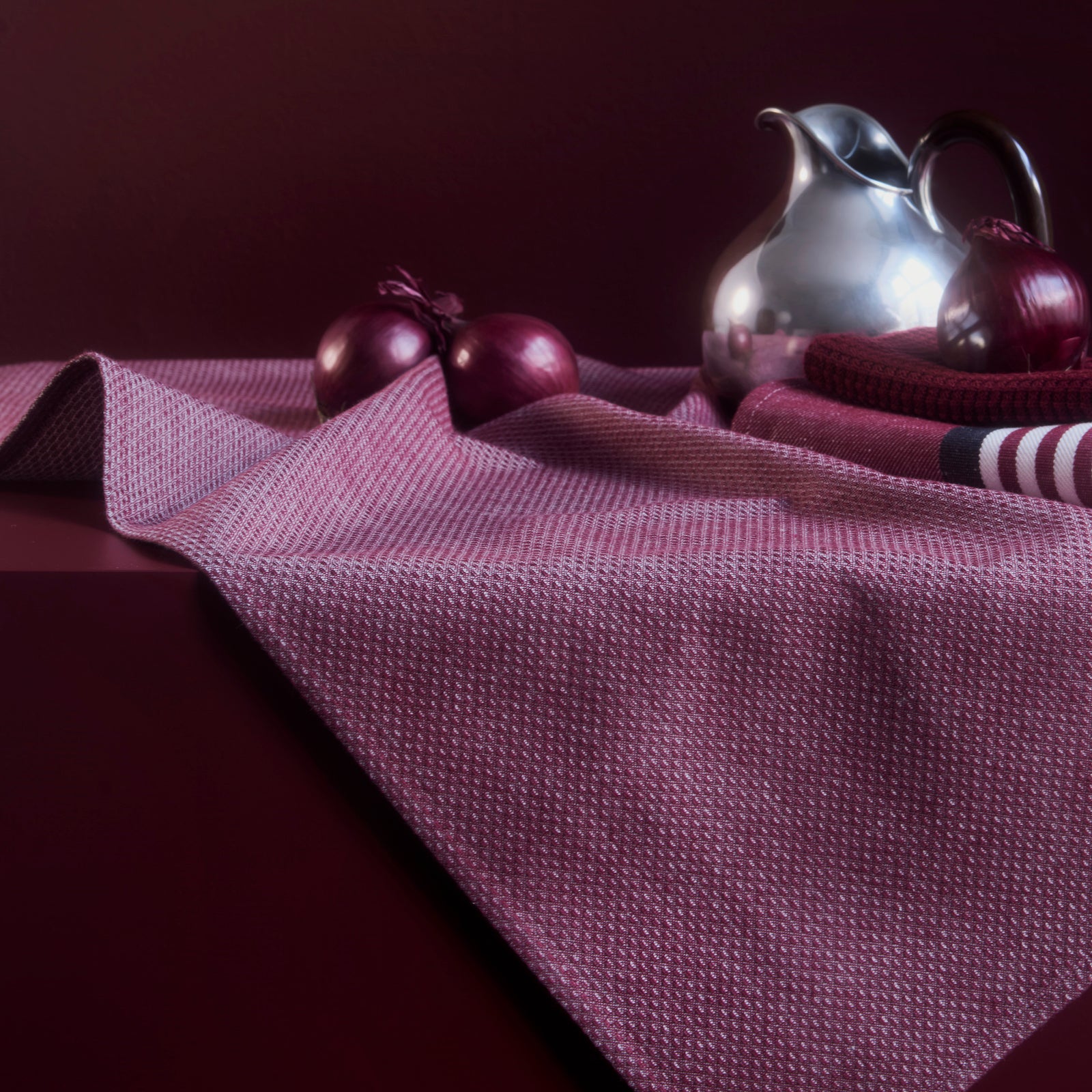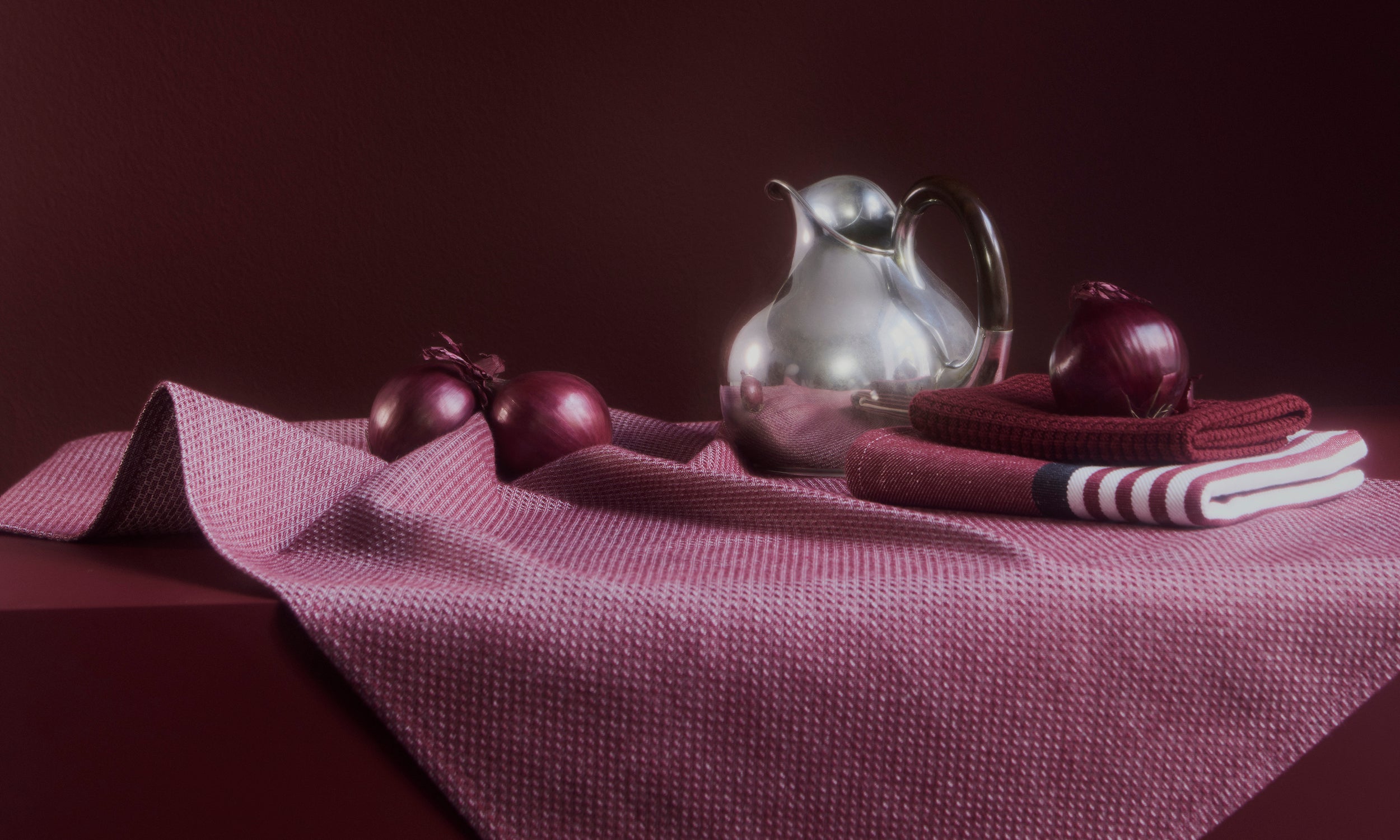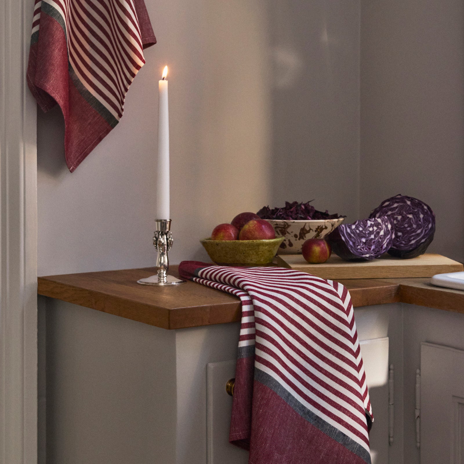 Klassiska kökstextilier i Carmine Red – en djup och distingerad röd färg.