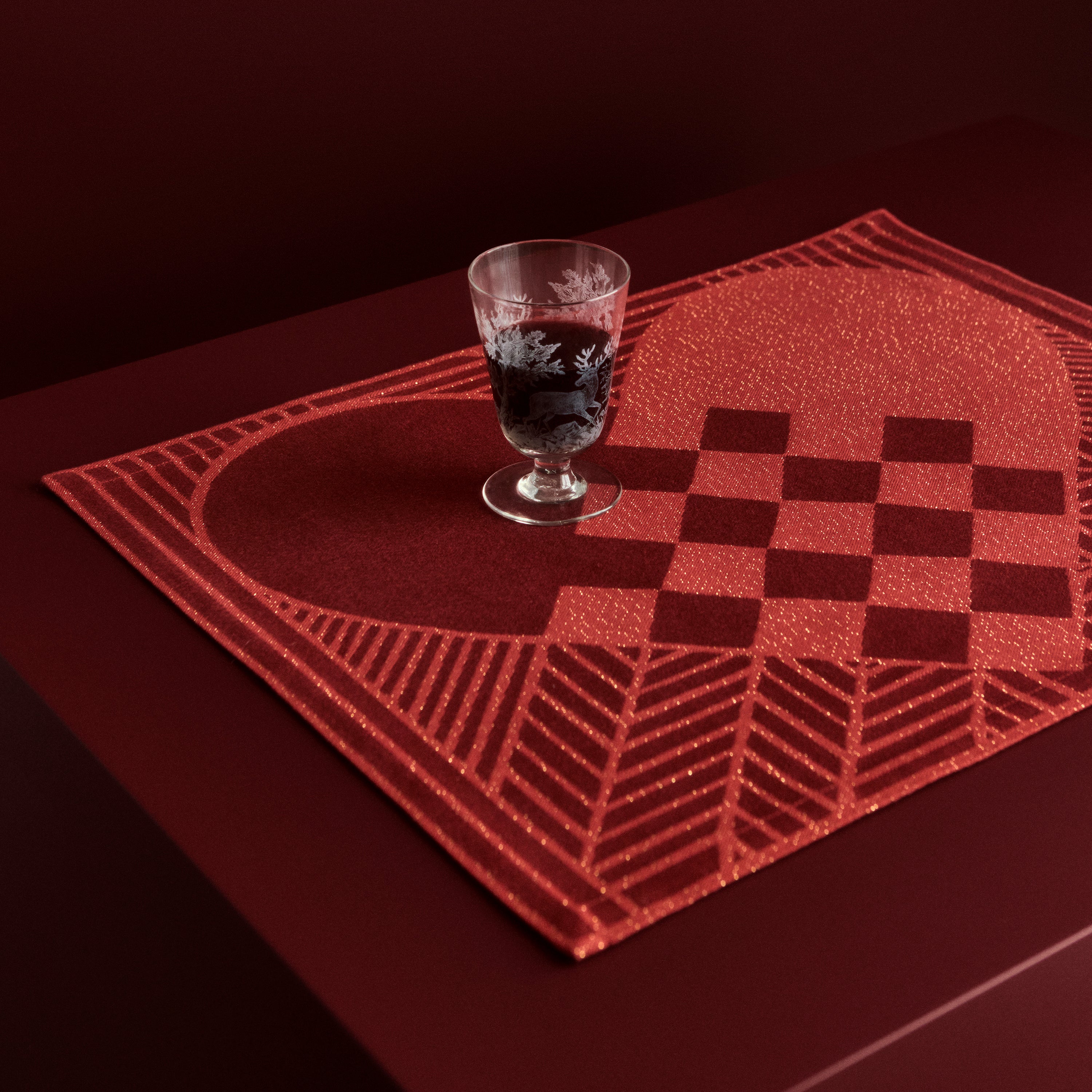 I anledning av juldesignets 50-årsjubileum har julbordstabletten fått en ny, gnistrande touch med gyllene, metalliska trådar vävda in i den delikata mörkröda bomullen.