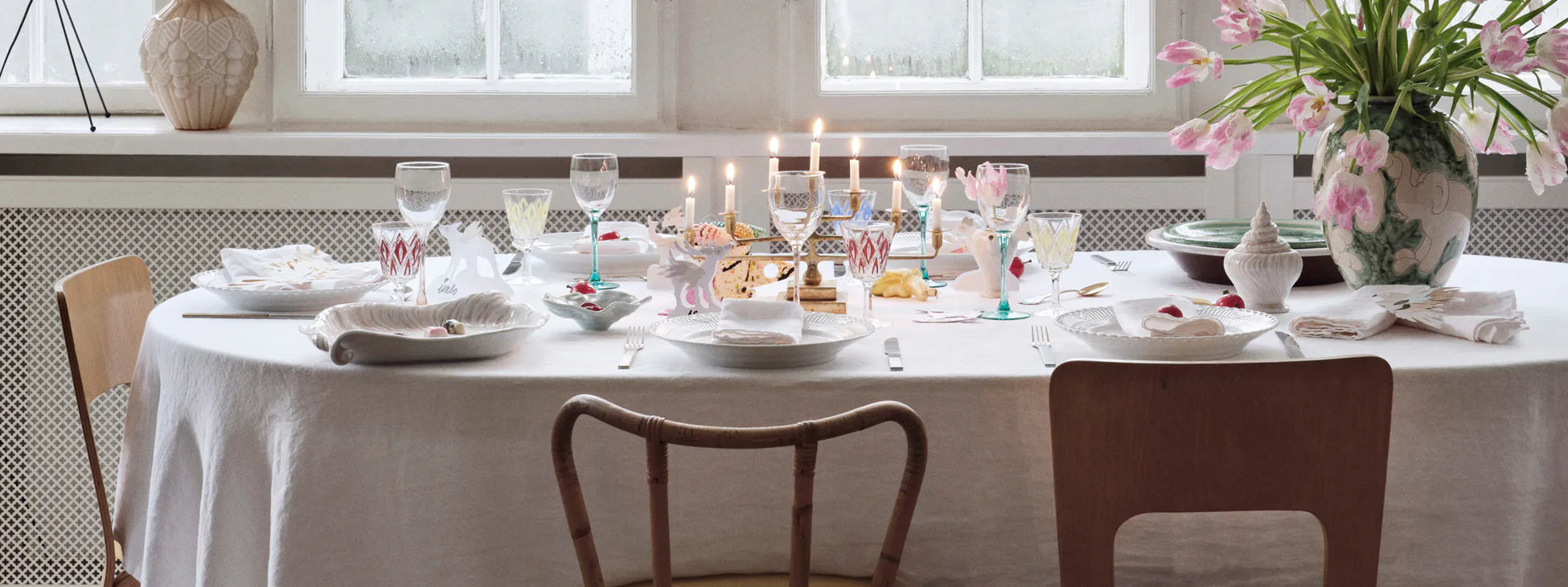 Det långa bordet i vardagsrummet är täckt med vita Royal Copenhagen-tallrikar som enligt As Øland ”skapar lite högtidlighet”. Där finns också vintagevinglas i olika färger, Griegst-porslin som gått i arv och finurliga juldekorationer som har samlats över tid.