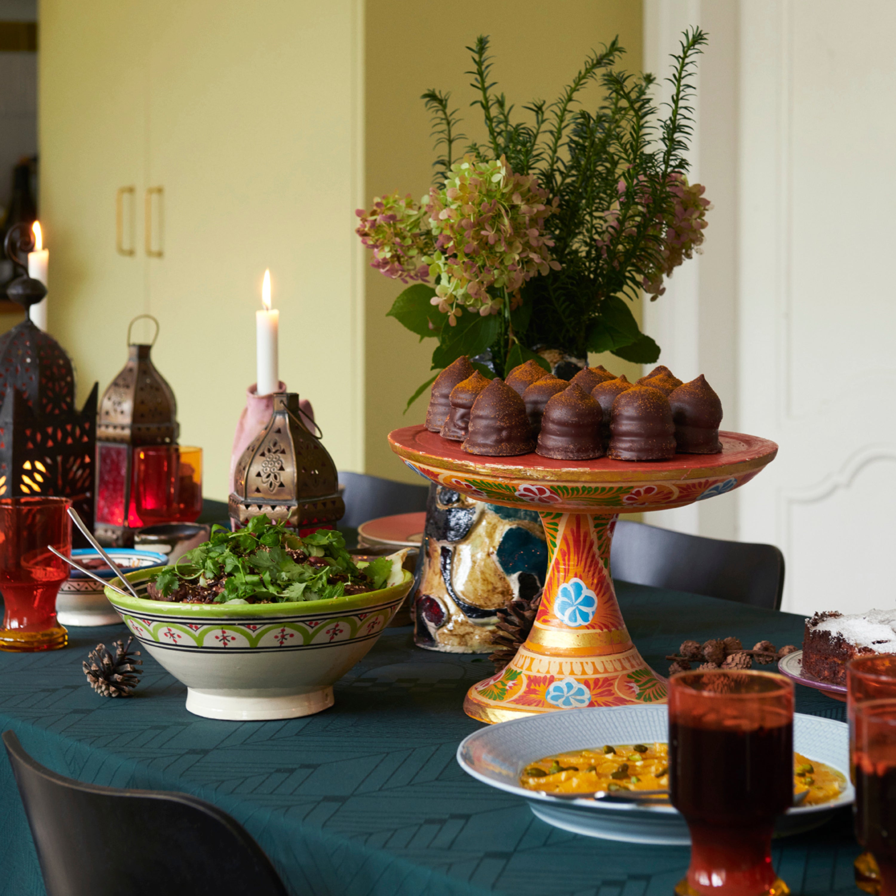CM: I köket brukar jag få hjälp av tre–fyra vänner, så att vi kan servera mat till alla gäster. Julevangeliet utspelar sig ju i Betlehem, vilket är anledningen till att maten har sitt ursprung i Mellanöstern. Jag har i många år gjort en dhal och en kryddig marockansk rätt med långkokt kött. Det finns alltid olika sallader med granatäpple, apelsin, tahinidressing och andra klassiska ingredienser från Mellanöstern. Vi serverar detta med traditionella danska julkakor och konfekt.