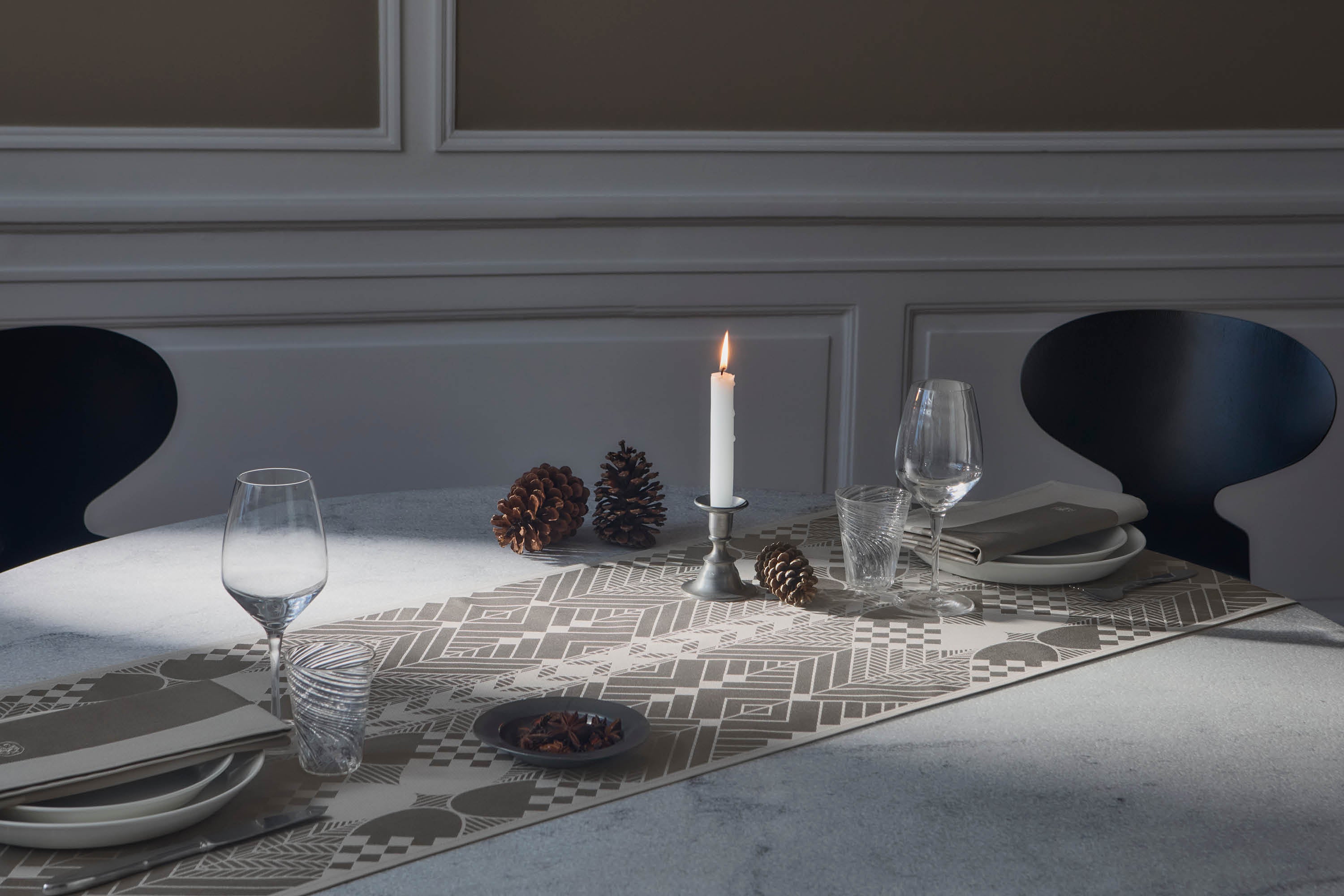 Georg Jensen Damasks ikoniska juldesign med flätade julhjärtan och stiliserade grankvistar framhävs vackert i färgen Hazel Wood. En färg som inspirerats av den släta, gråbruna barken på gamla hasselträd. Perfekt för den eleganta och naturliga juldukningen.