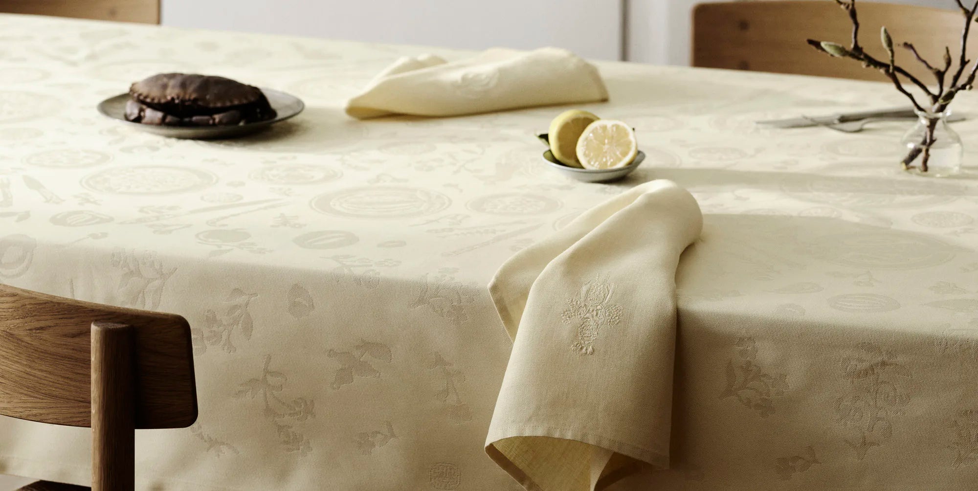 När Christian IV på 1620-talet bjöd in till middag på Rosenborgs slott krävdes det en speciell duk som kunde stå i centrum för måltiden och den festliga stunden. Duken hade motiv av element från renässansmåltiden och inte minst ett invävt Christian IV-monogram. Nu lanserar Georg Jensen Damask en modern tolkning av den historiska duken i färgerna Pale Yellow och Soft Rose. Banquet-duken är fotograferad på Rosenborgs slott.