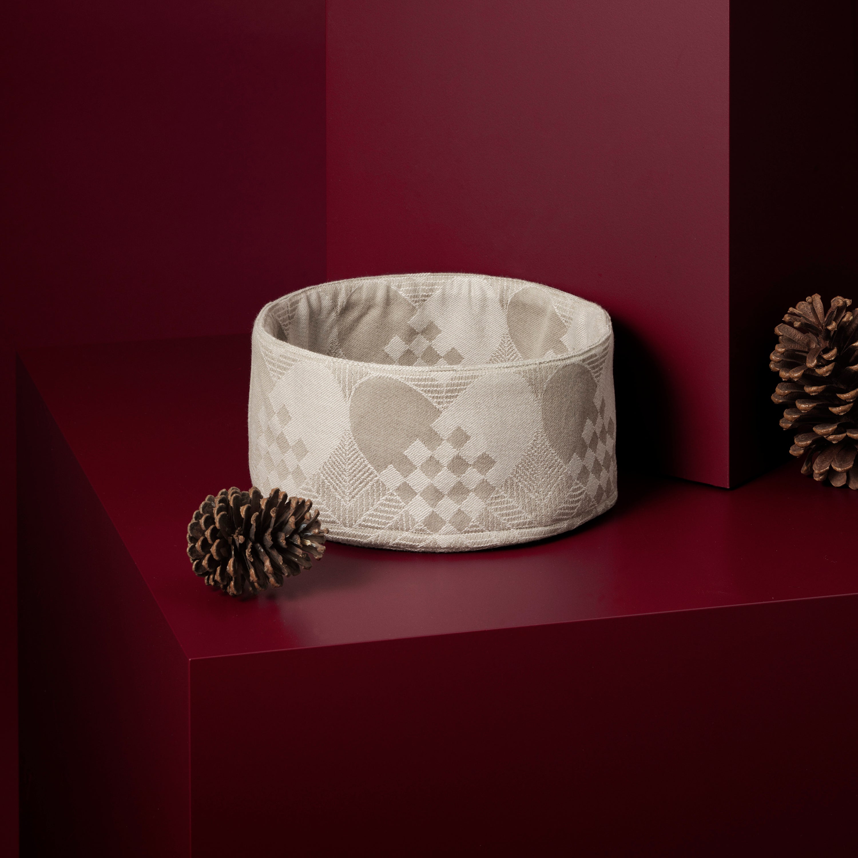 Christmas-bordstablettens stämningsfulla motiv av fina flätade julhjärtan och stiliserade grankvistar skapades av textilkonstnär Bodil Bødtker-Næss 1975 och har blivit en signaturprodukt i Georg Jensen Damasks kollektion.