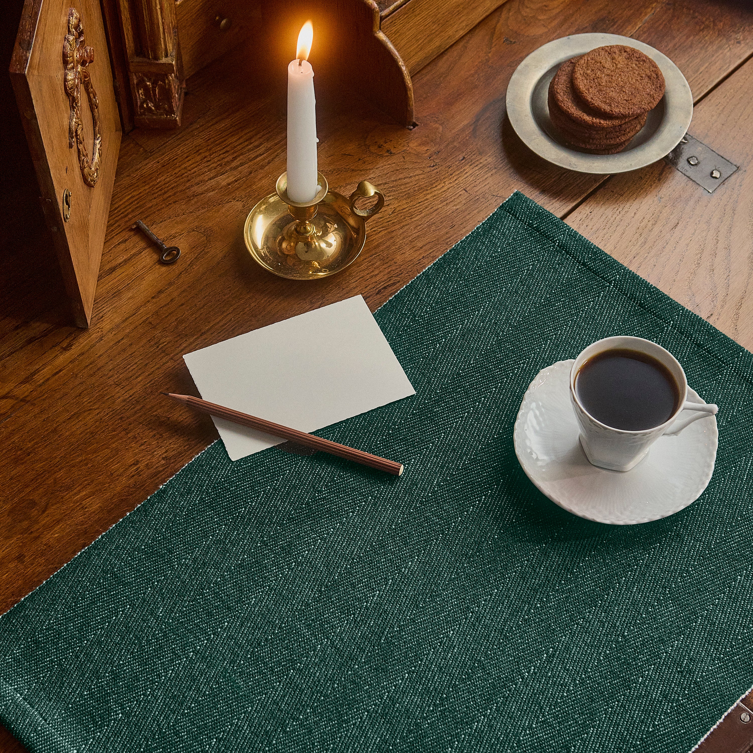 Herringbone-bordstabletterna är fiskbensvävda i 100 % bomull och finns i både runda och rektangulära versioner. Vävmetoden ger det karaktäristiska fiskbensmönstret och de kraftiga garnerna gör att bordstabletterna känns tunga på bordet. De har en liten broderad Georg Jensen Damask-logotyp i samma färg som väven.