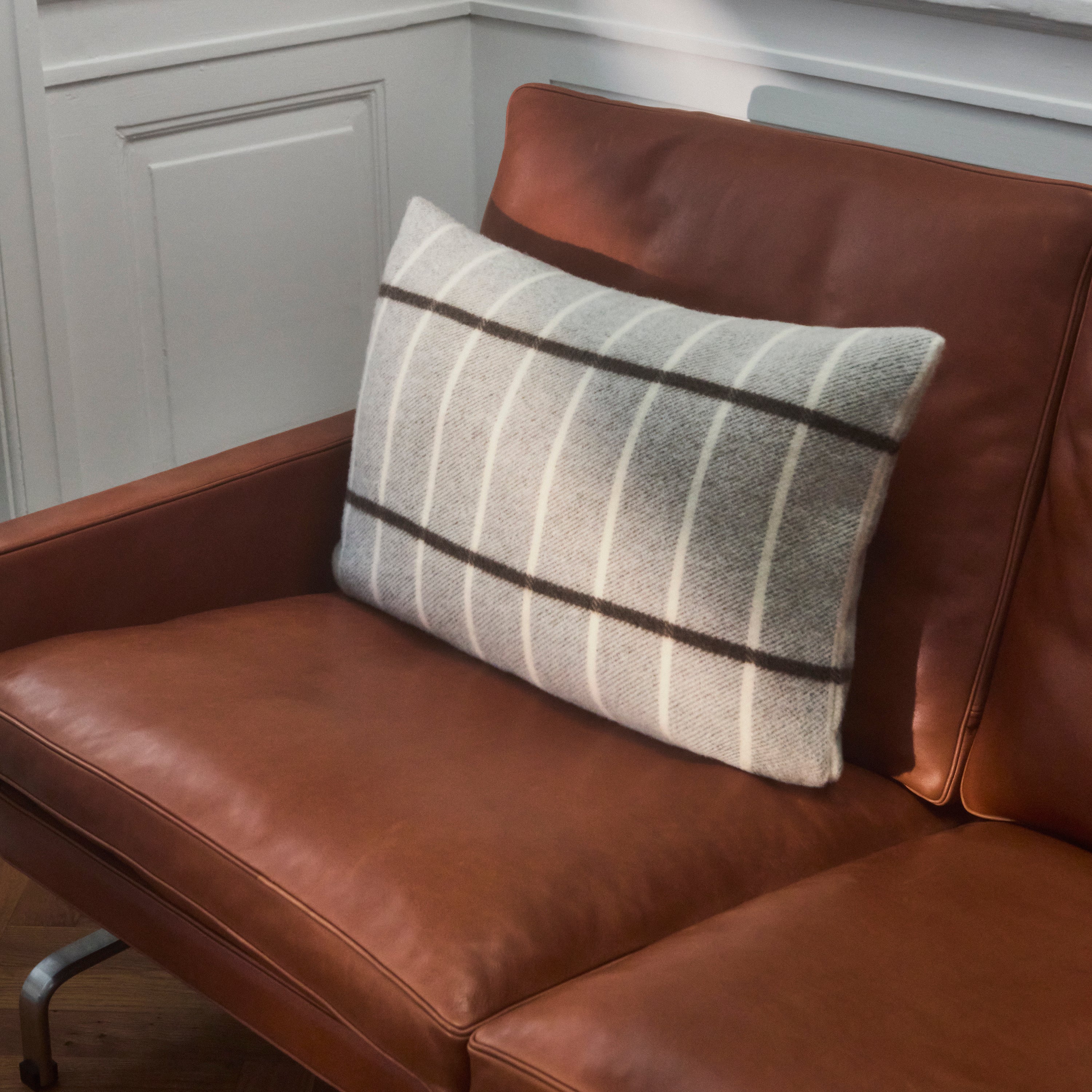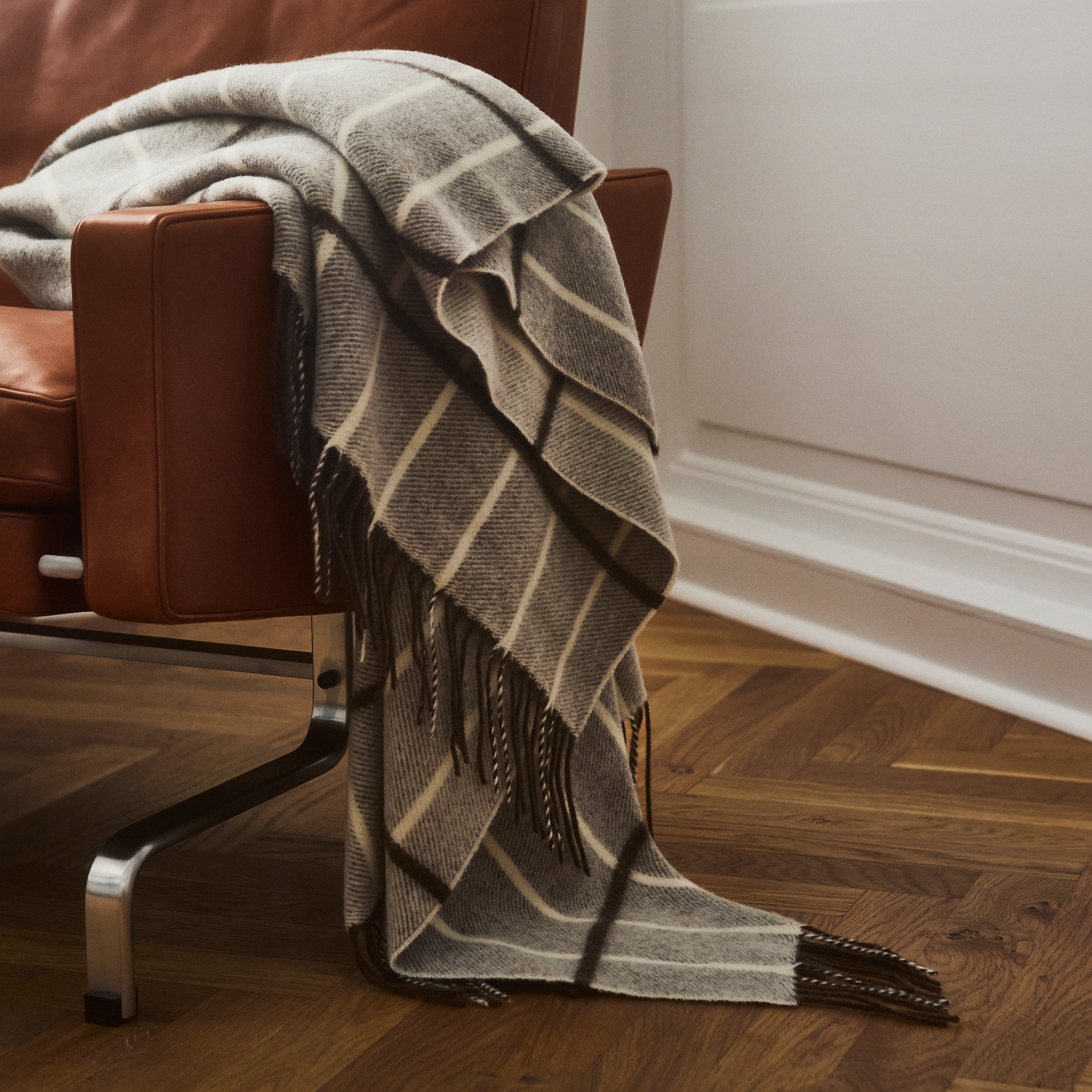 Union-plädens fina kvalitet i merinoull och kashmir ger en vacker yta och en särskild mjukhet. Den subtila skillnaden i ljusgrå nyanser på fram- och baksidan ger pläden ett stilrent utseende.