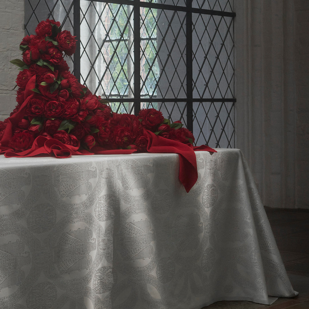 ”Sct. Knuds Ørne-duken rymmer både viktig dansk historia och personliga släktberättelser som ger den en speciell plats i Georg Jensen Damask-kollektionen. Vi har kunder som berättar att de ärvt duken av sin gammelmormor eller gammelfarmor eller ätit på den med sina mor- och farföräldrar. Det är en duk som förenar generationer.” Anne Hviid, ägare av Georg Jensen Damask.