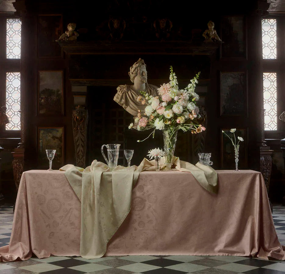 Når Christian 4. i 1620’erne inviterede til middag på Rosenborg Slot, krævede det en særlig pragtdug, der kunne være samlingspunkt for det gode måltid og den festlige stund. Dugen havde motiv af elementer fra renæssancemåltidet og ikke mindst et indvævet Christian 4.-monogram. Nu lancerer Georg Jensen Damask en moderne fortolkning af den historiske dug i farverne Pale Yellow og Soft Rose. Banquet-dugen er fotograferet på Rosenborg Slot.
