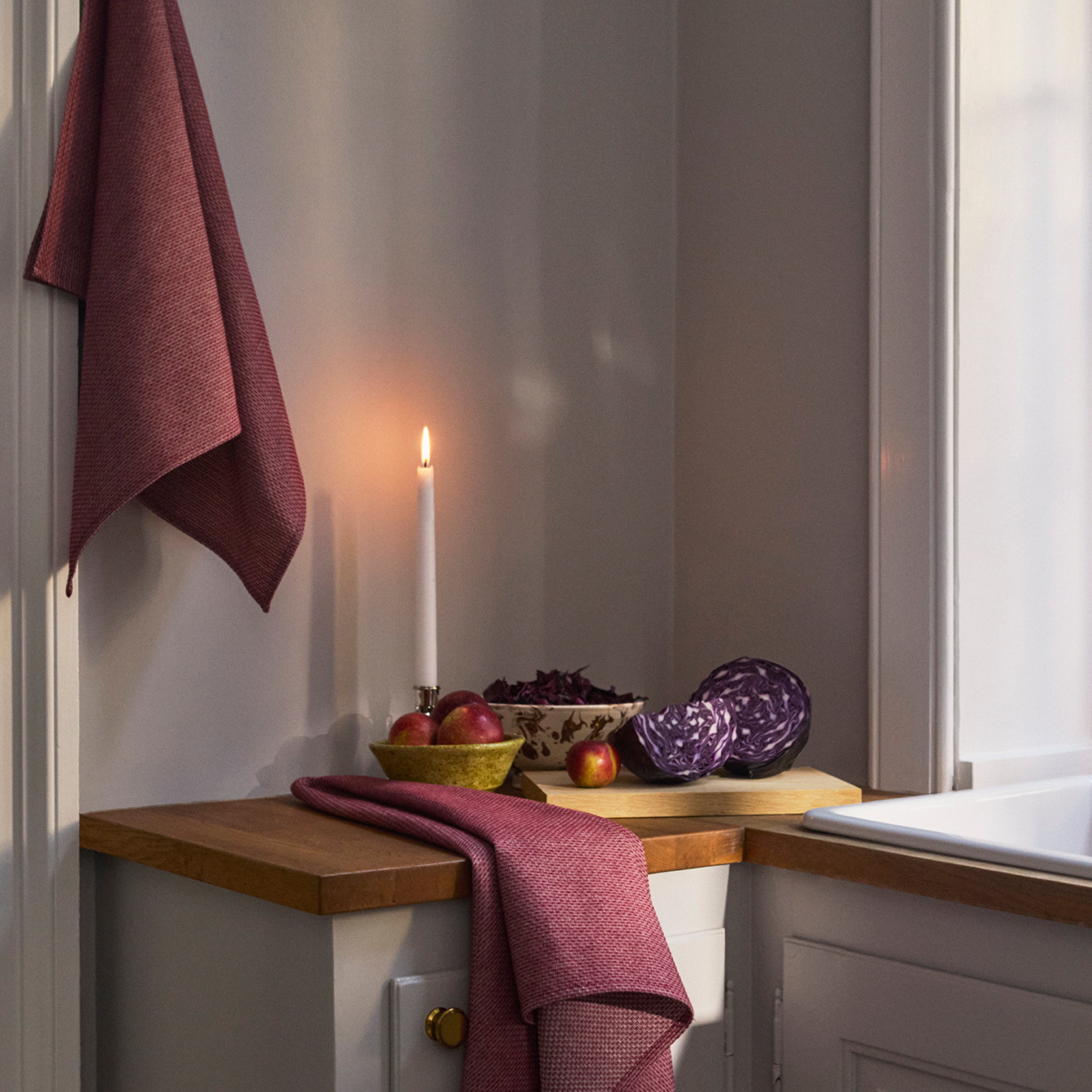 1959-køkkenhåndklædets kraftige kvalitet gør det muligt at bruge det både som håndklæde og viskestykke. Tekstilingeniør Bent Georg Jensen, som står bag det elegante design, stod i spidsen for Georg Jensen Damask igennem mange år og var drivkraft i designudviklingen.