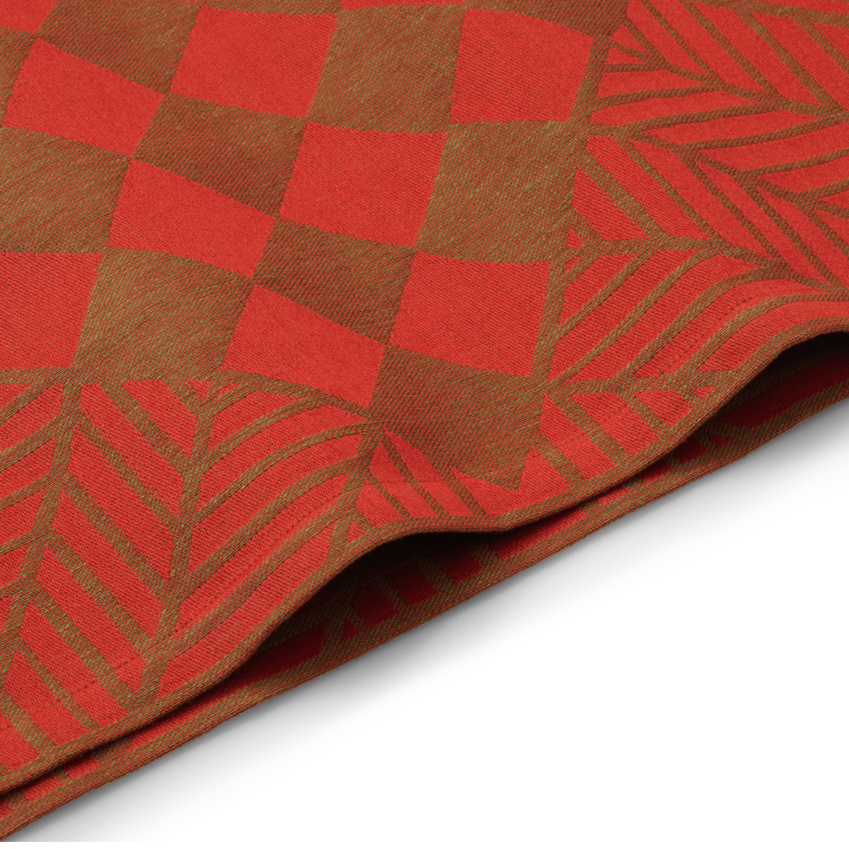 Christmas Rustic-dækkeserviettens nostalgiske motiv med fine, flettede julehjerter og stiliserede grankviste er designet af tekstilkunstner Bodil Bødtker-Næss. Motivet er blevet et signaturdesign i Georg Jensen Damasks kollektionen. Archive Red er en af de originale farver fra 1975. Den helt klassiske farvekombination i rød og guld.