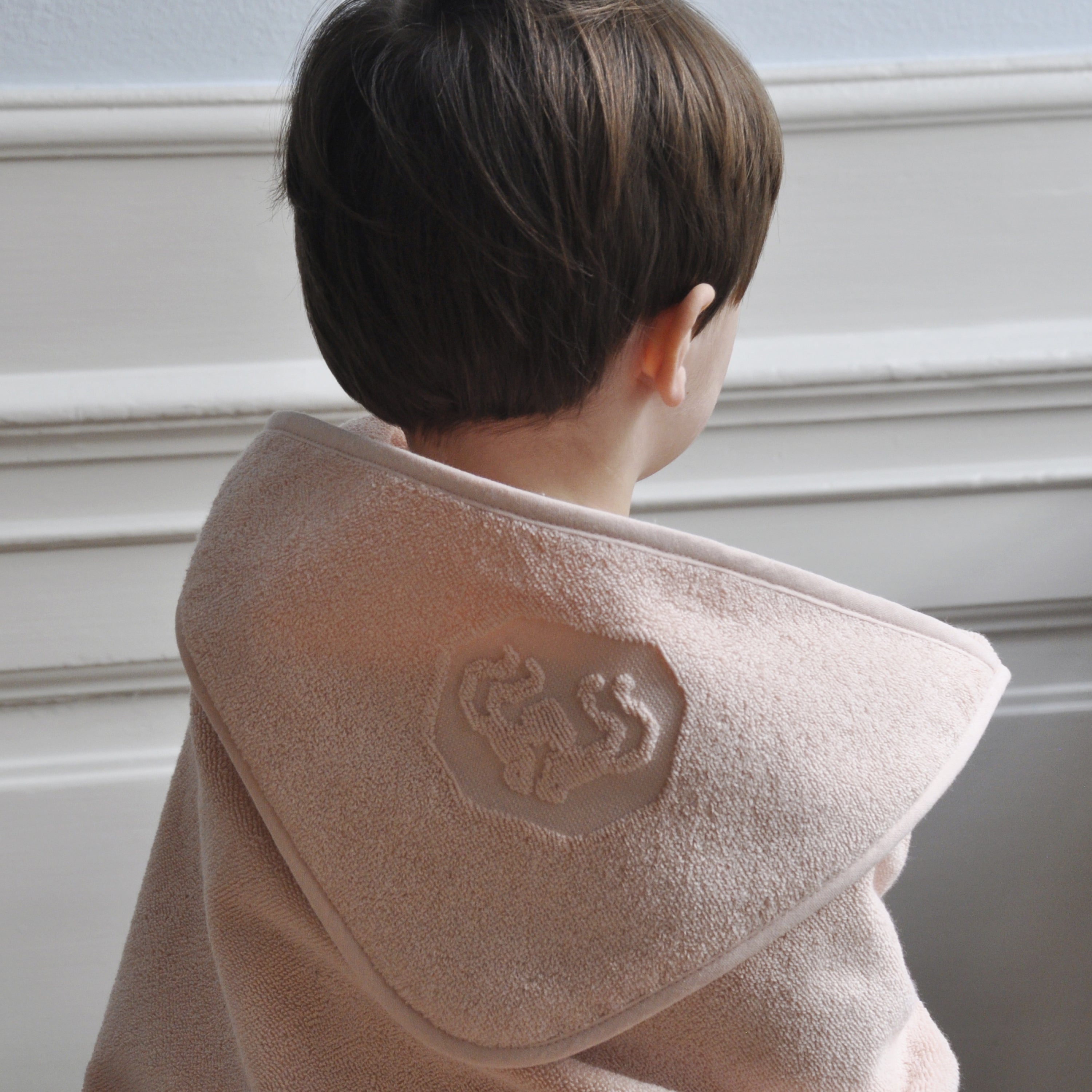 Hætten med et lille indvævet logo skaber en varm og tryg fornemmelse, og håndklædets store størrelse gør, at barnet kan bruge det i mange år – både hjemme efter et bad og ved poolen eller på stranden.