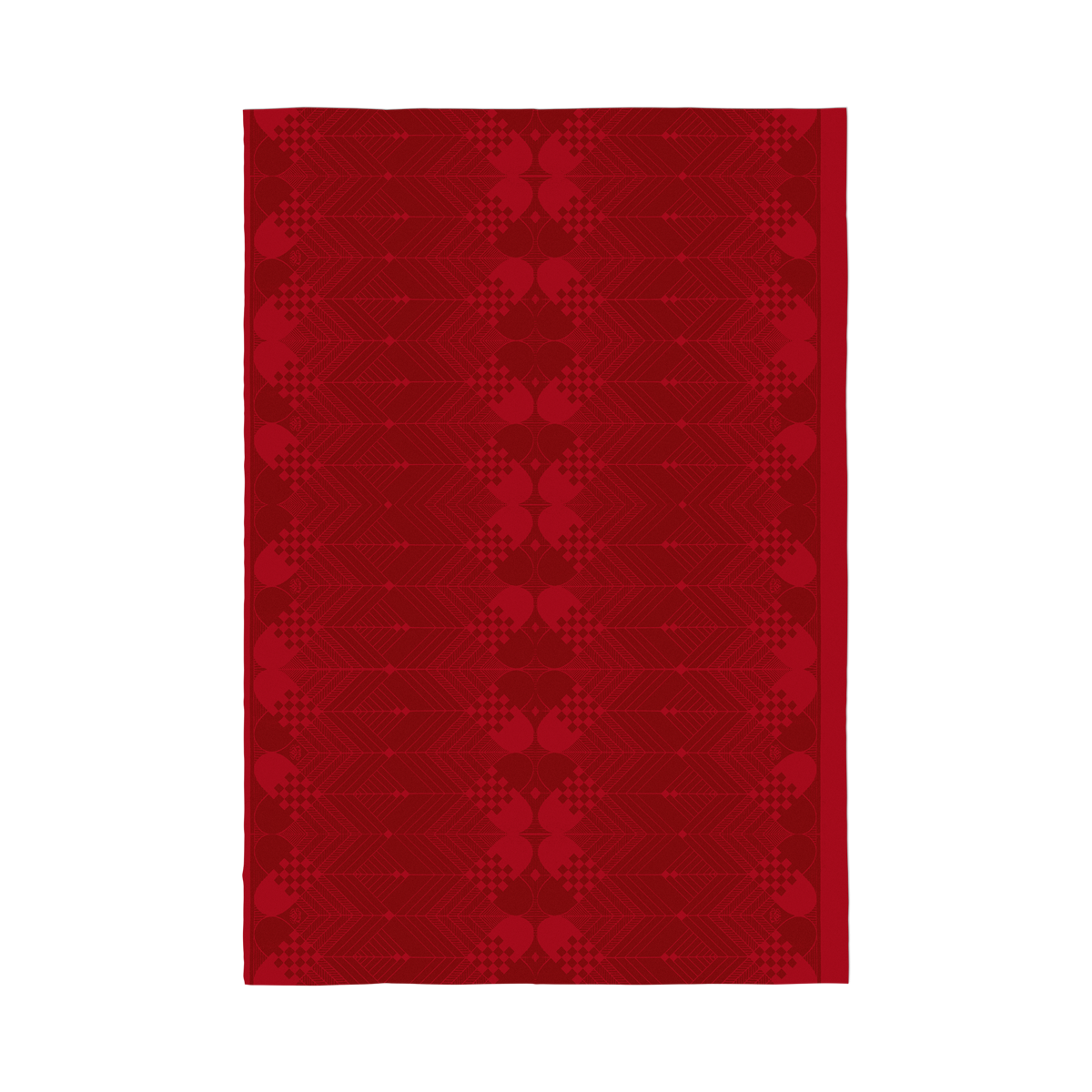 Juledugen er vævet i 100 % bomuld med et mønster af flettede julehjerter og stiliserede grankviste. Varianten Deep Red er holdt i julens klassiske røde farve.