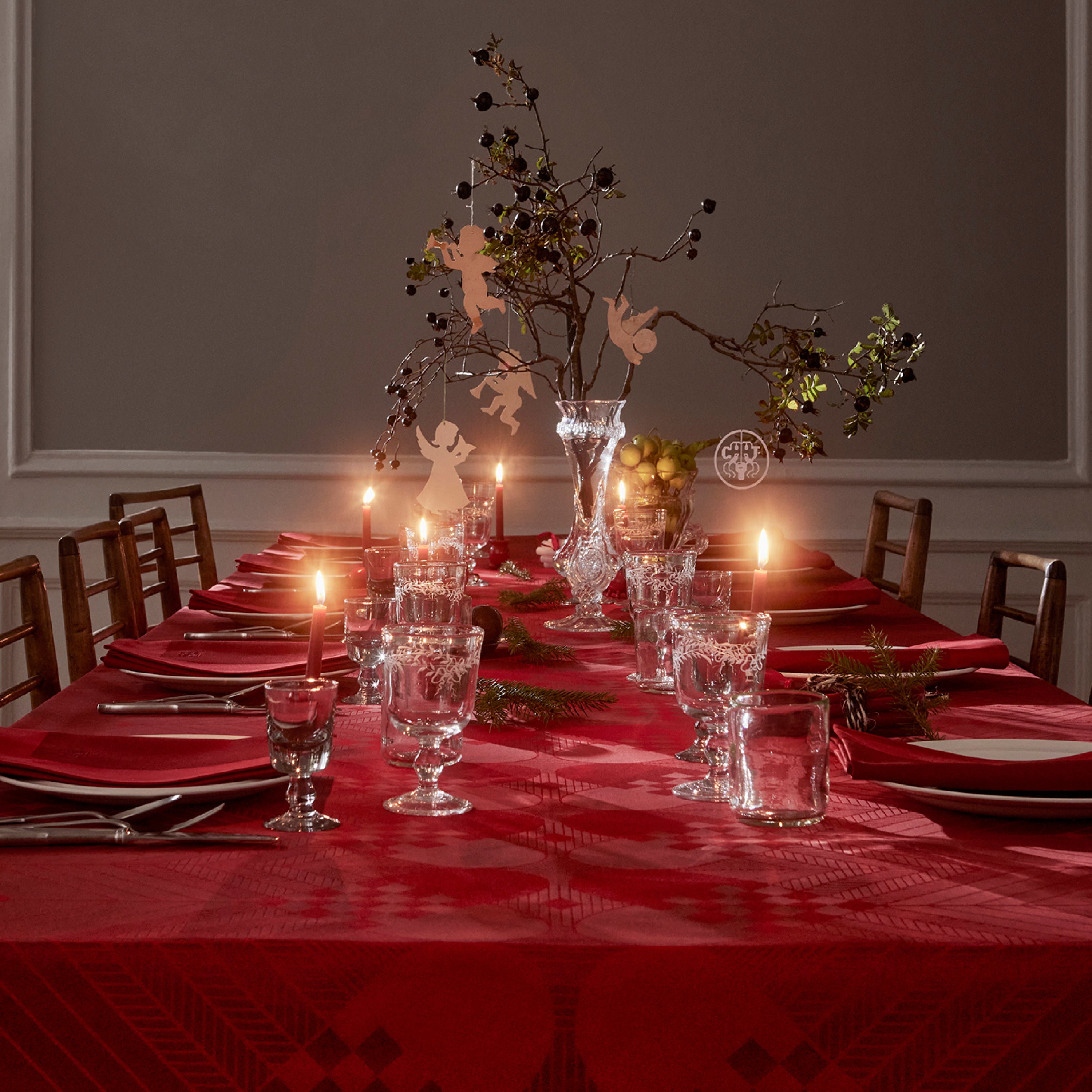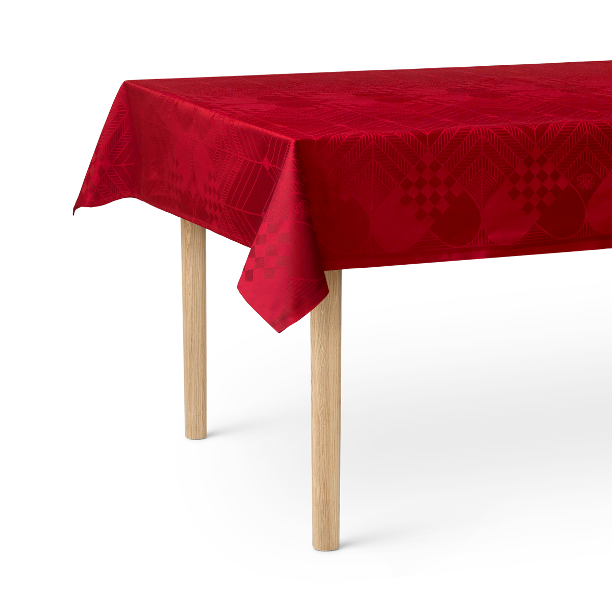 Den mørkerøde variant er vævet i tone-i-tone nuancer af julens ikoniske farve, hvilket giver Juledugen en enkel, klassisk og stilfuld fremtoning. Læg denne dug på bordet, og mærk julestemningen brede sig. Matchende stofservietter fuldender udtrykket.