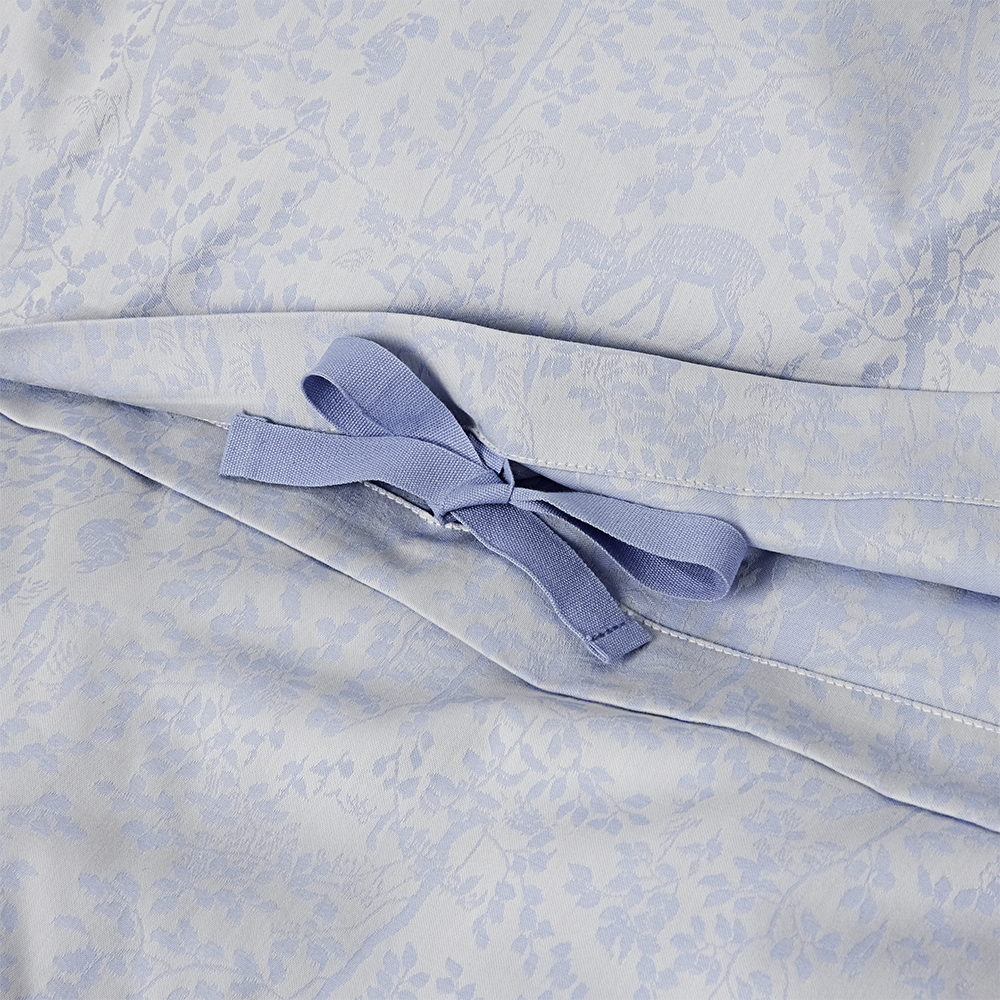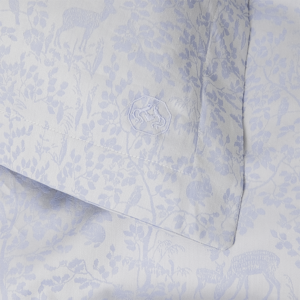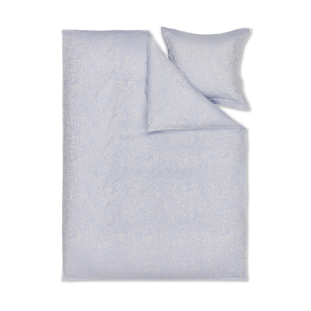 Forest er et jacquardvævet børnesengesæt i 100 % økologisk bomuld. Sengesættet i farven Clear Blue har det lille karakteristiske Georg Jensen Damask-børnelogo broderet i det ene hjørne.