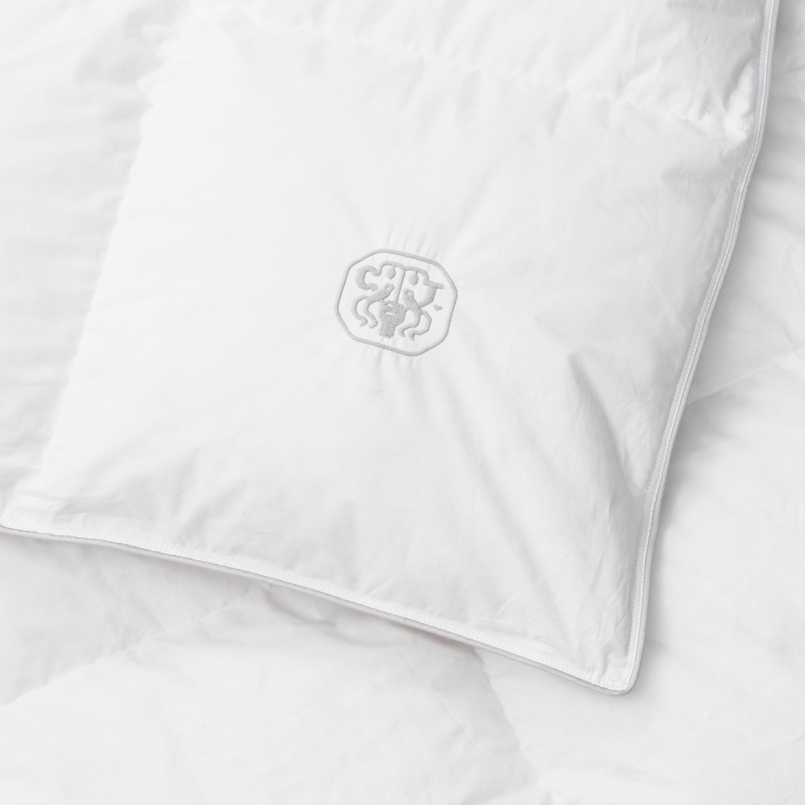 Dynen bærer Georg Jensen Damasks ikoniske logo som et diskret broderi – et symbol på kvalitet og omhyggelighed.