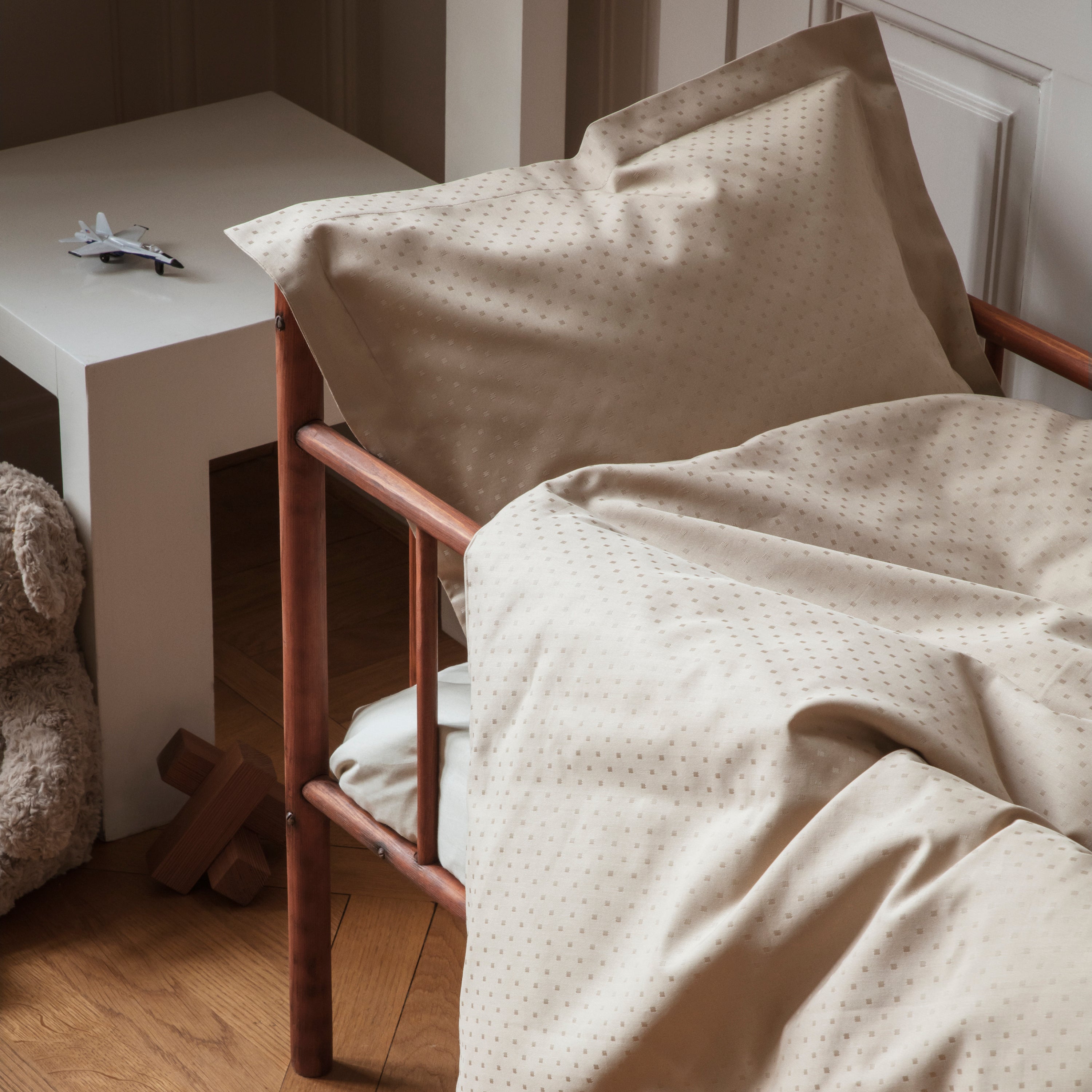 Nordlys sengetøjet til familiens yngste har et elegant design, hvor nordlysets organiske former er oversat til et tidløst, geometrisk mønster. Light Oak er en mørk beige nuance med et roligt og harmonisk udtryk.