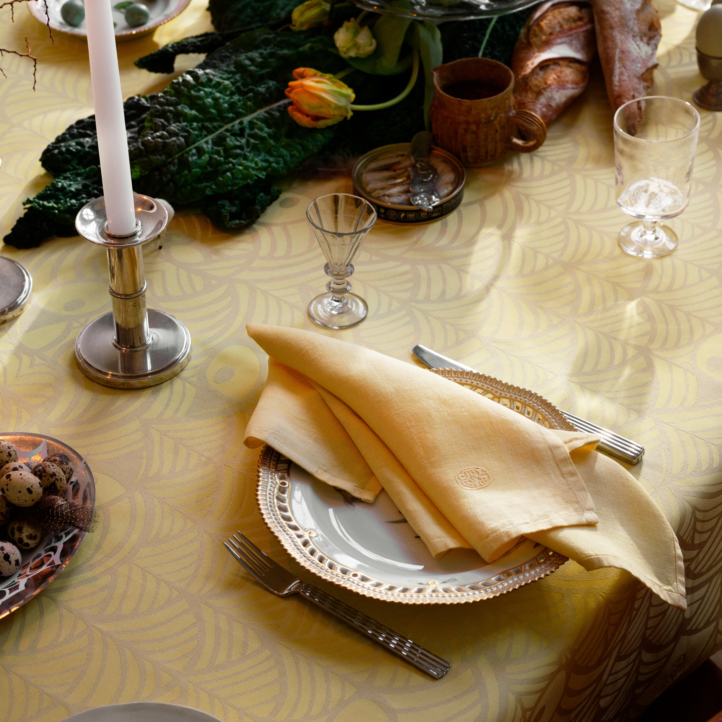 Med sin raffinerede gule farve danner dugen ikke alene den perfekte baggrund for påskefrokostens pynt og traditioner, som samler generationer ved bordet. Den bliver også i sig selv en tradition, som det er en glæde at finde frem i påsketiden år efter år. Matchende stofservietter fuldender udtrykket.