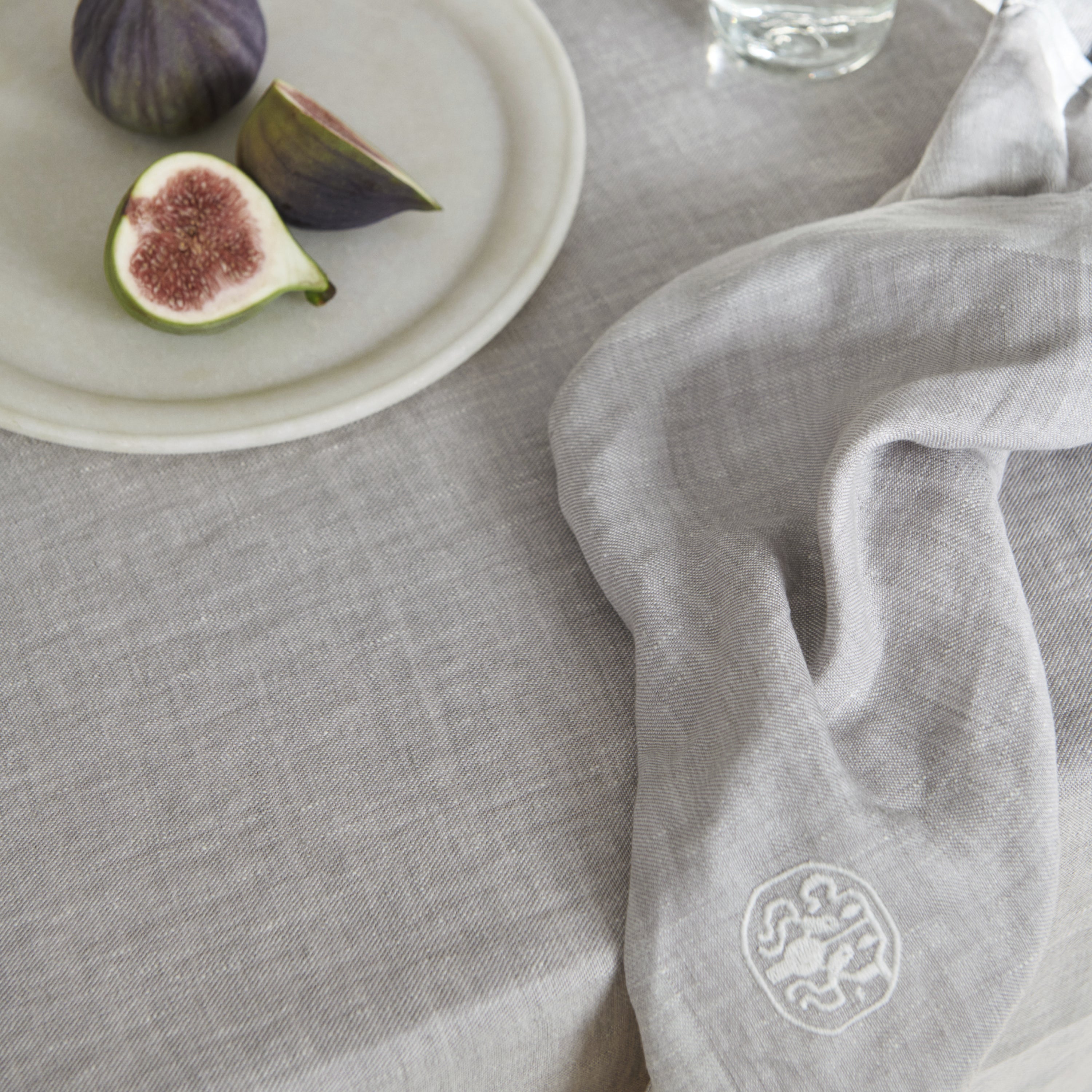 Med sit enkle design er den grå hørserviet med broderet logo en smuk og raffineret tilføjelse til borddækningen. Den er meget velegnet i en klassisk opdækning, men kan også skabe værdi og være en æstetisk oplevelse i en mere uformel sammenhæng, hvor der dækkes op uden dug. Lige så skøn til store middage som det enkle morgenmåltid eller ved havebordet.