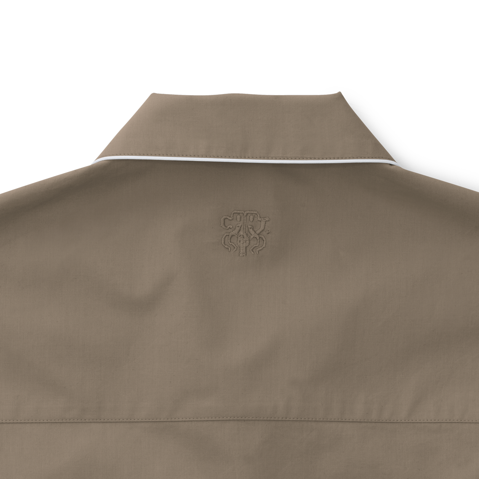 Skjorten har sideslidser, brystlomme, afrundet krave og Georg Jensen Damasks ikoniske logo broderet på bærestykket i nakken. Bukserne har en bred og behagelig elastik i taljen, lommer og snørelukning. Bukse- og ærmelængde kan let tilpasses med et opsmøg, hvor indersiden har en elegant piping.