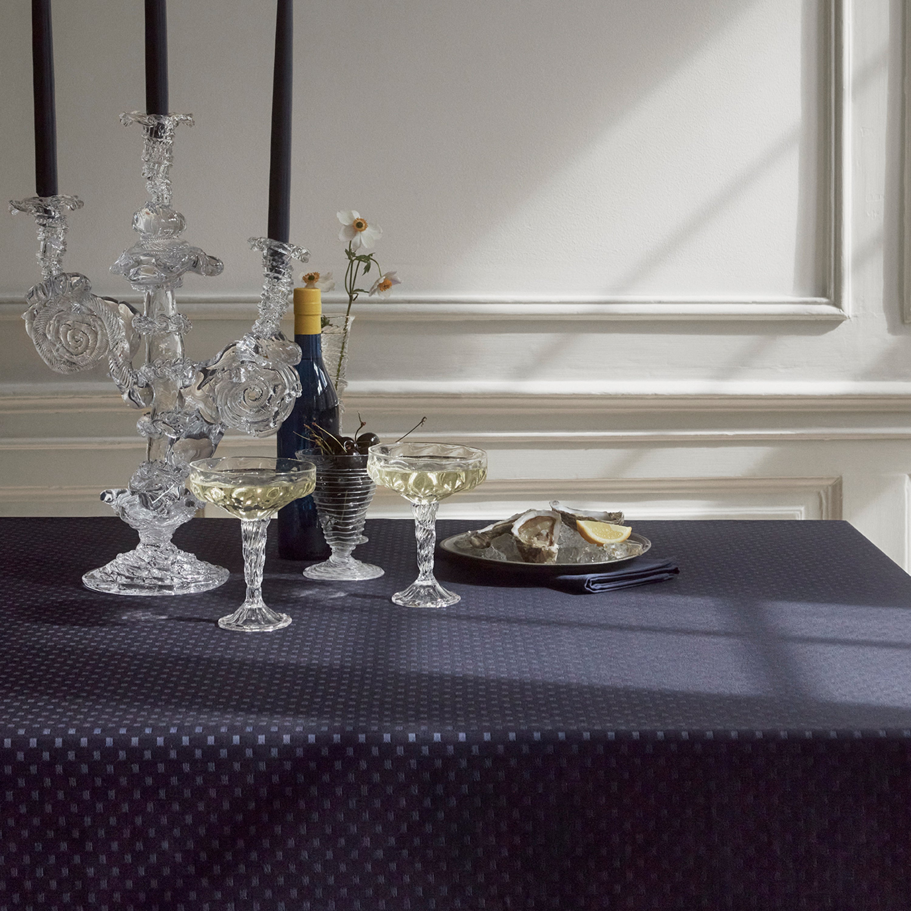 Den intense dybde i farven Dark Blue forstærker det rene design og lader snefnuggene tone frem, som var de stjerner på aftenhimlen. En nobel og eksklusiv damaskdug, der ikke kalder på en særlig indretningsstil, men fuldendes i opdækningen med tilbehør efter humør, årstid og måltid.