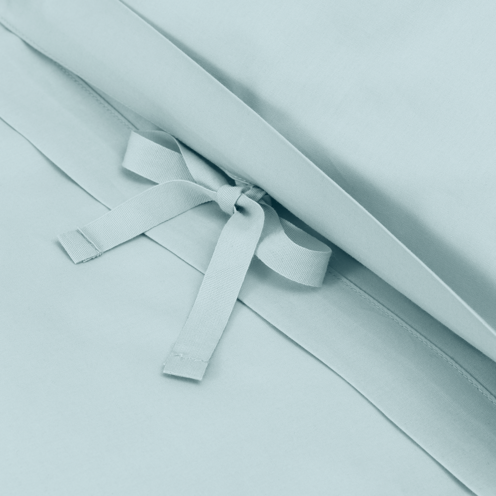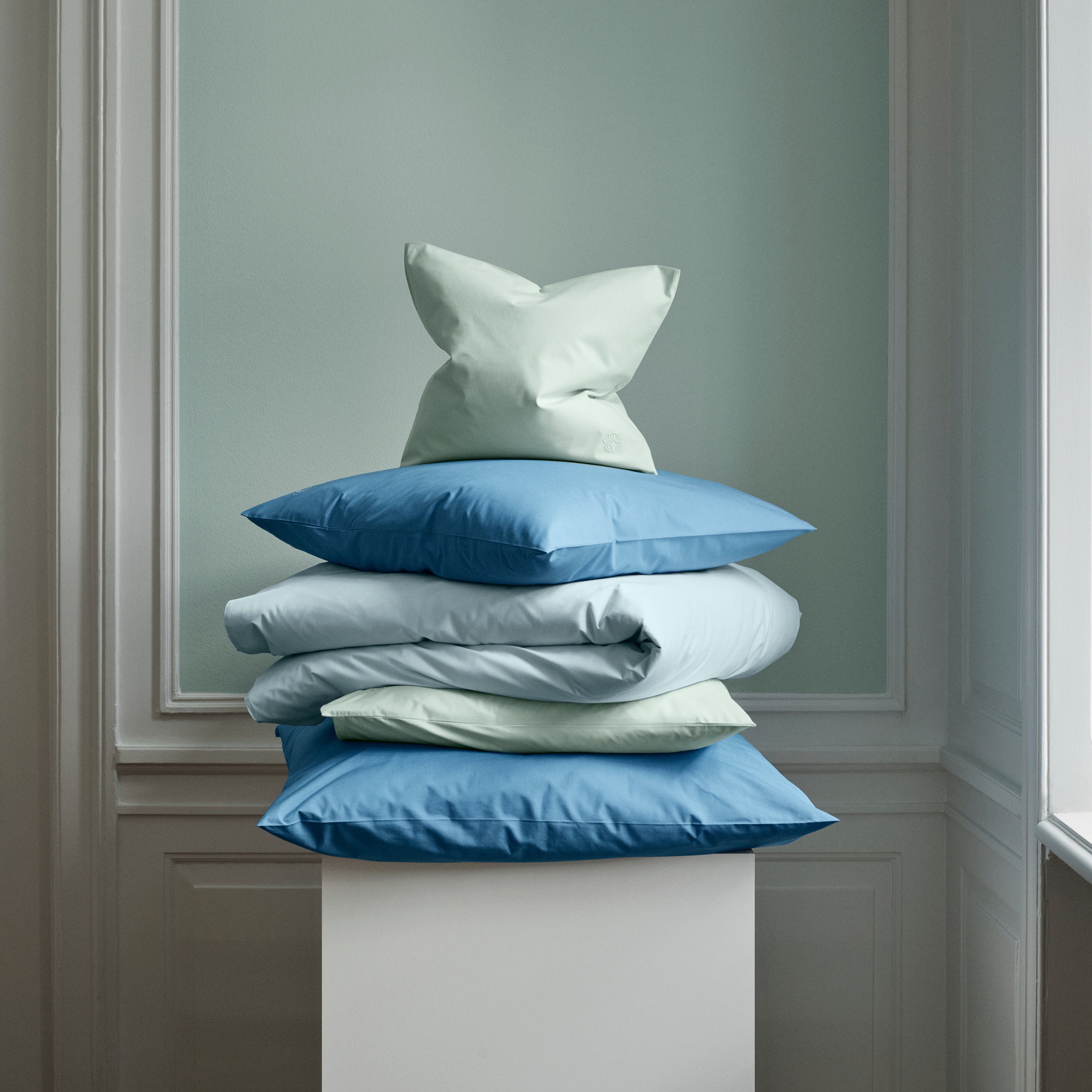 Dynebetrækket lukkes med bændler og hovedpudebetrækkene har kuvertlukning. Sengesættet bærer Georg Jensen Damasks ikoniske logo som et diskret broderi. Minimal Blue er en helt let variant af lyseblå med et strejf af aquanuancer.