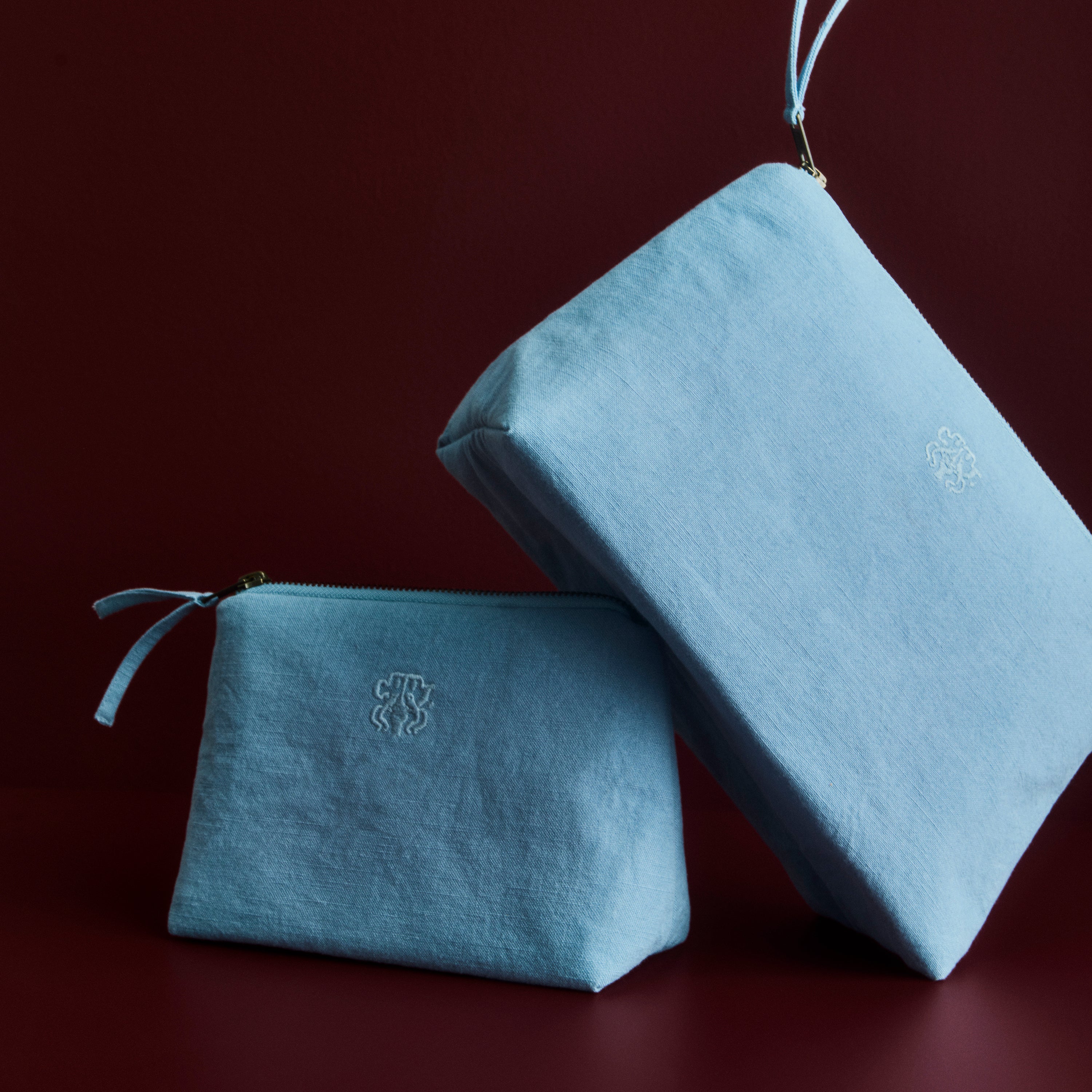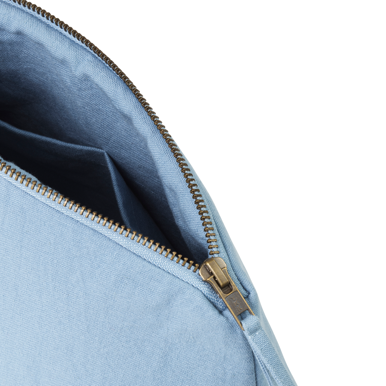 Funktionel og rummelig toilettaske i et tidløst design. All toilettasken er vævet i 100 % bomuld med en indre lomme og har Georg Jensen Damasks logo broderet som elegant detalje. Farven Blue Hour er en smuk og tidløs, mellemblå farve.