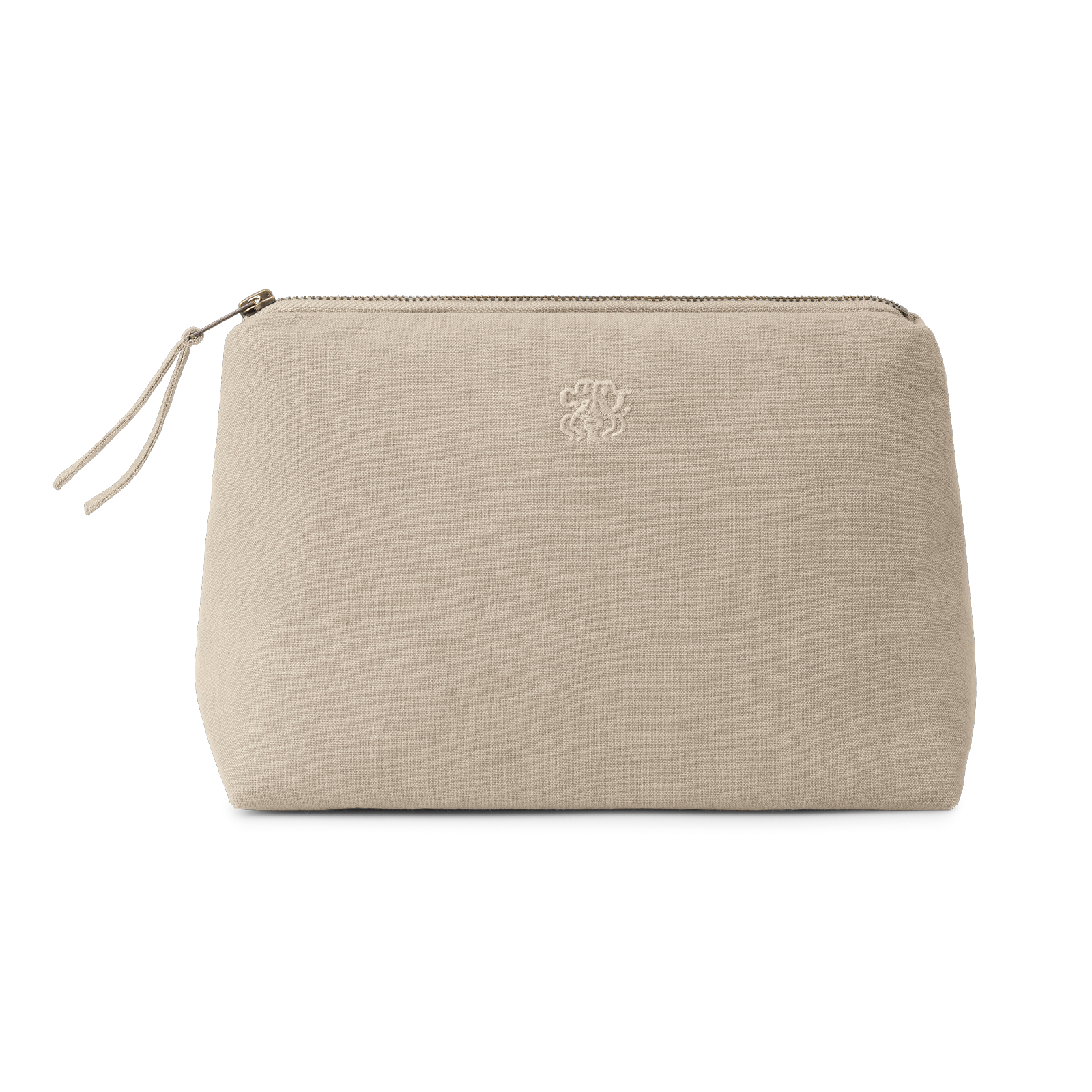 Funktionel og rummelig toilettaske i et tidløst design. All toilettasken er vævet i 100 % bomuld med en indre lomme og har Georg Jensen Damasks logo broderet som elegant detalje. Farven Cashmere er en diskret, brun nuance af grå, der har et roligt og eksklusivt udtryk – inspireret af råfarven på kashmirfårets uld.