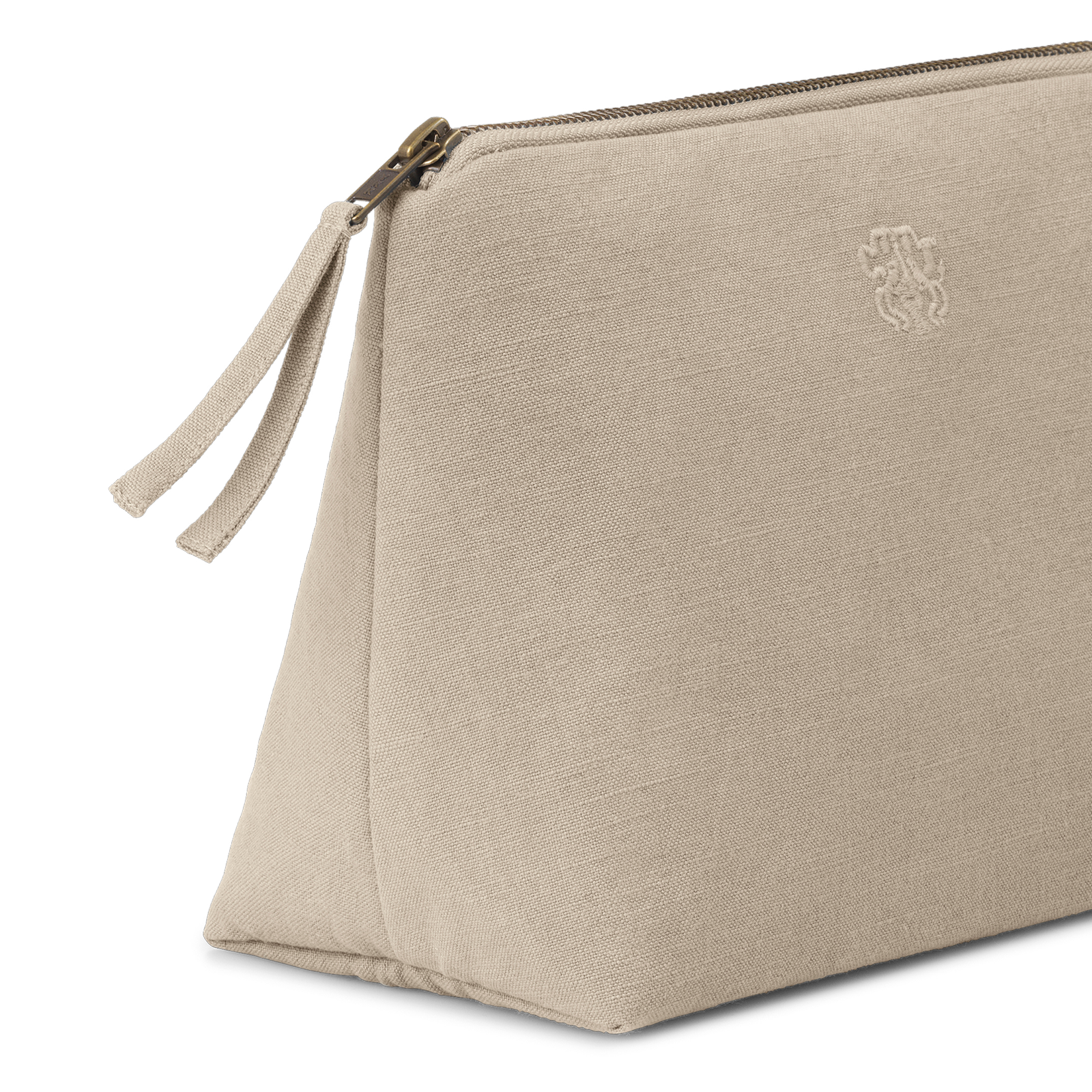 Den funktionella och rymliga necessären och sminkvaskan är lärredsvävd i 100 % bomull med en innerficka och har Georg Jensen Damasks logo broderat som en elegant detalj.