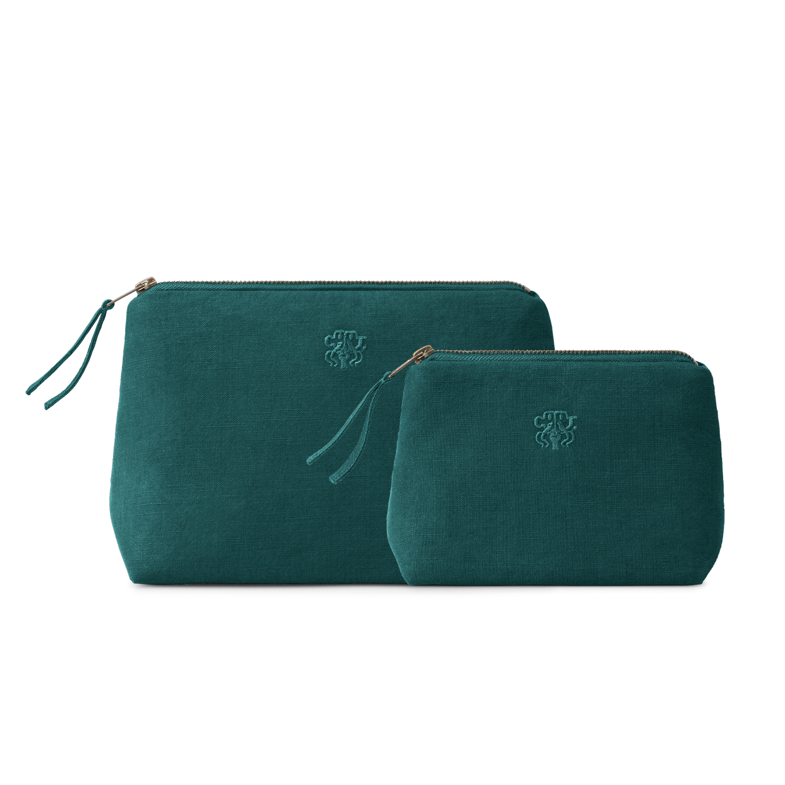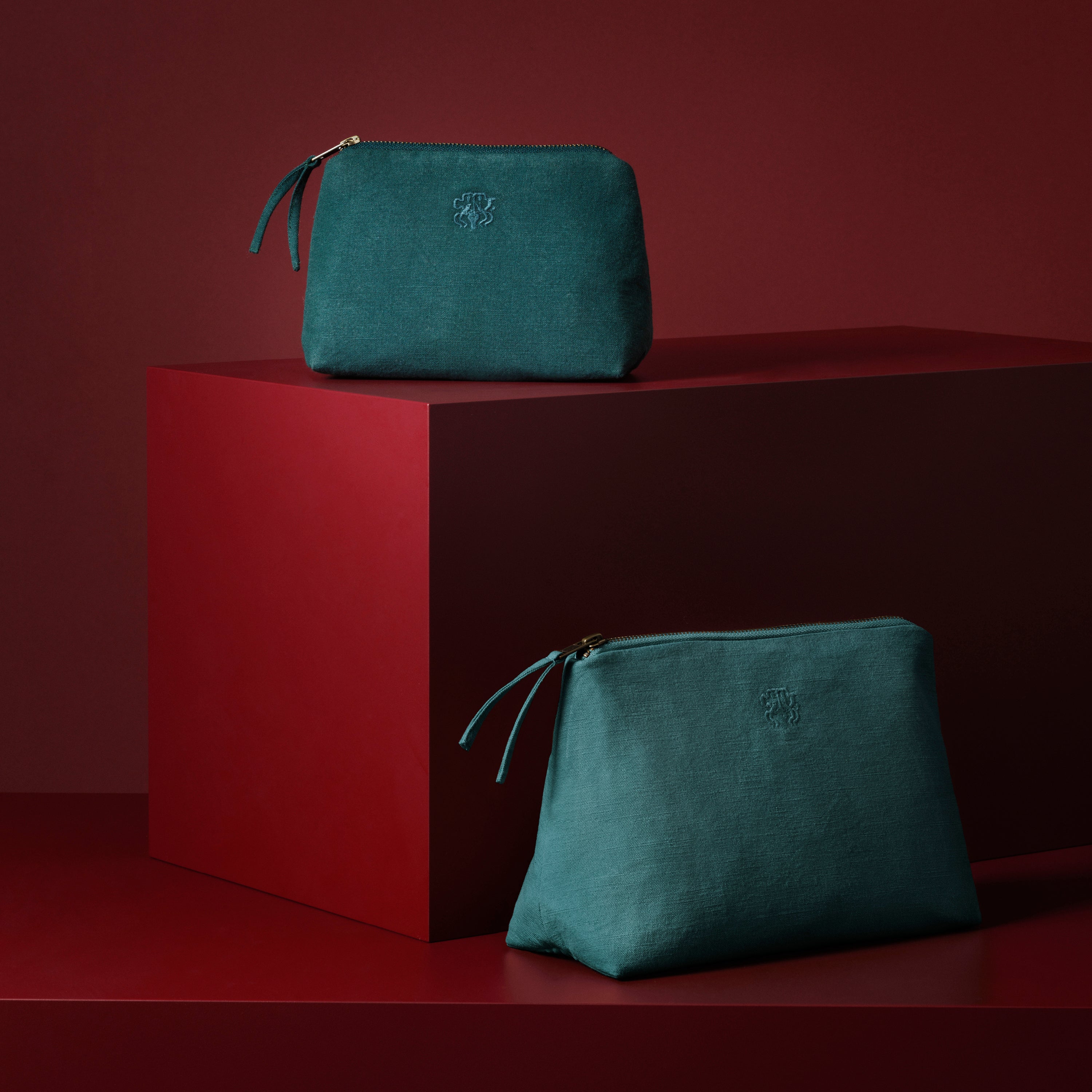 All necessär och sminkväska i färgen Evergreen – en helt mörk och sval grön. Den funktionella och rymliga necessären och sminkväskan är canvasvävda i 100 % bomull med en innerficka och har Georg Jensen Damasks logo broderat som en elegant detalj.