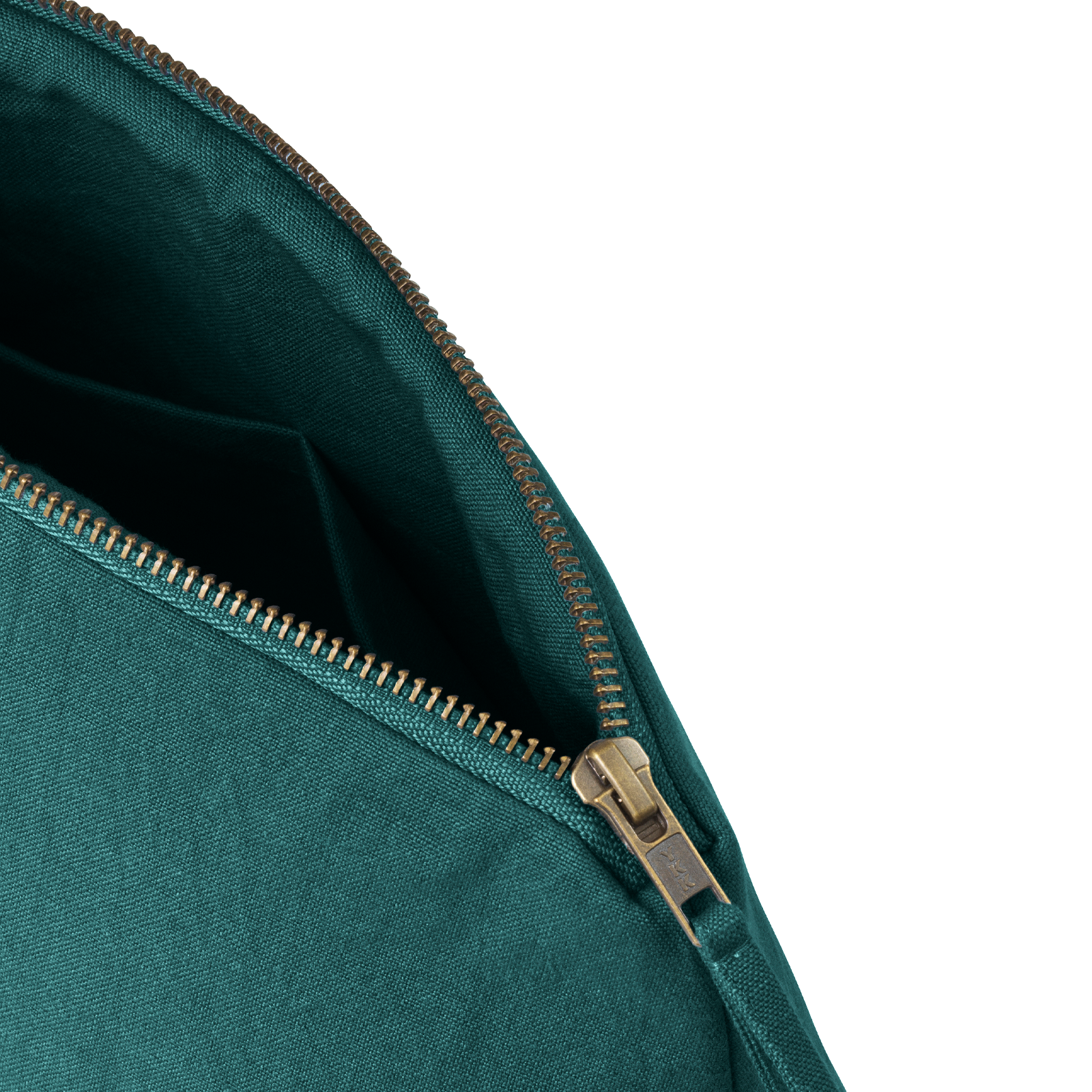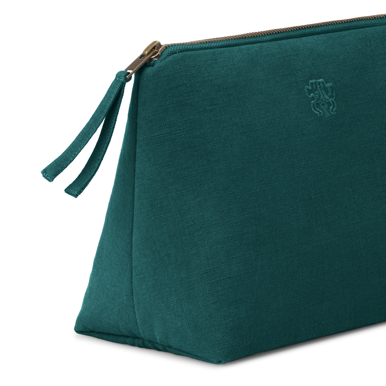 All necessär och sminkväska i färgen Evergreen – en helt mörk och sval grön. Den funktionella och rymliga necessären och sminkväskan är canvasvävda i 100 % bomull med en innerficka och har Georg Jensen Damasks logo broderat som en elegant detalj.