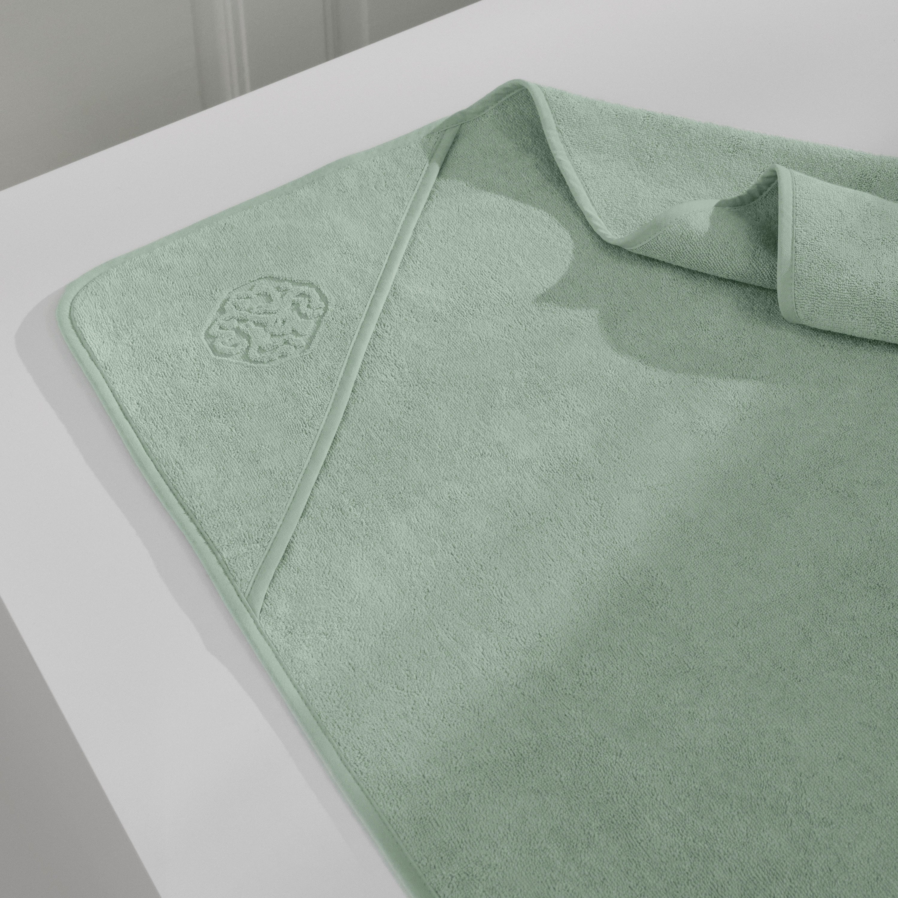 Mjuk frottéhandduk med huva för barn. Damask Terry-handduken har ett enkelt uttryck med Georg Jensen Damasks ikoniska vävarfågel invävd som en elegant detalj på huvan. Den klara grönblå färgen, Glass Green, är inspirerad av färgen på råglas.