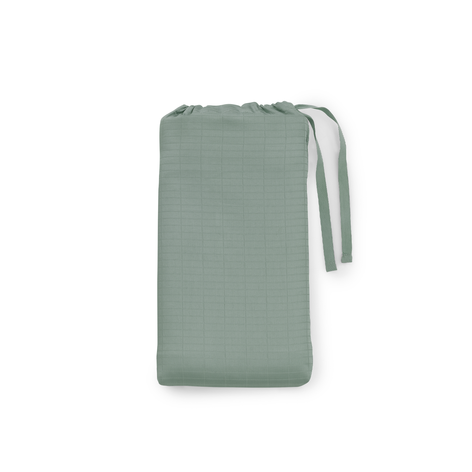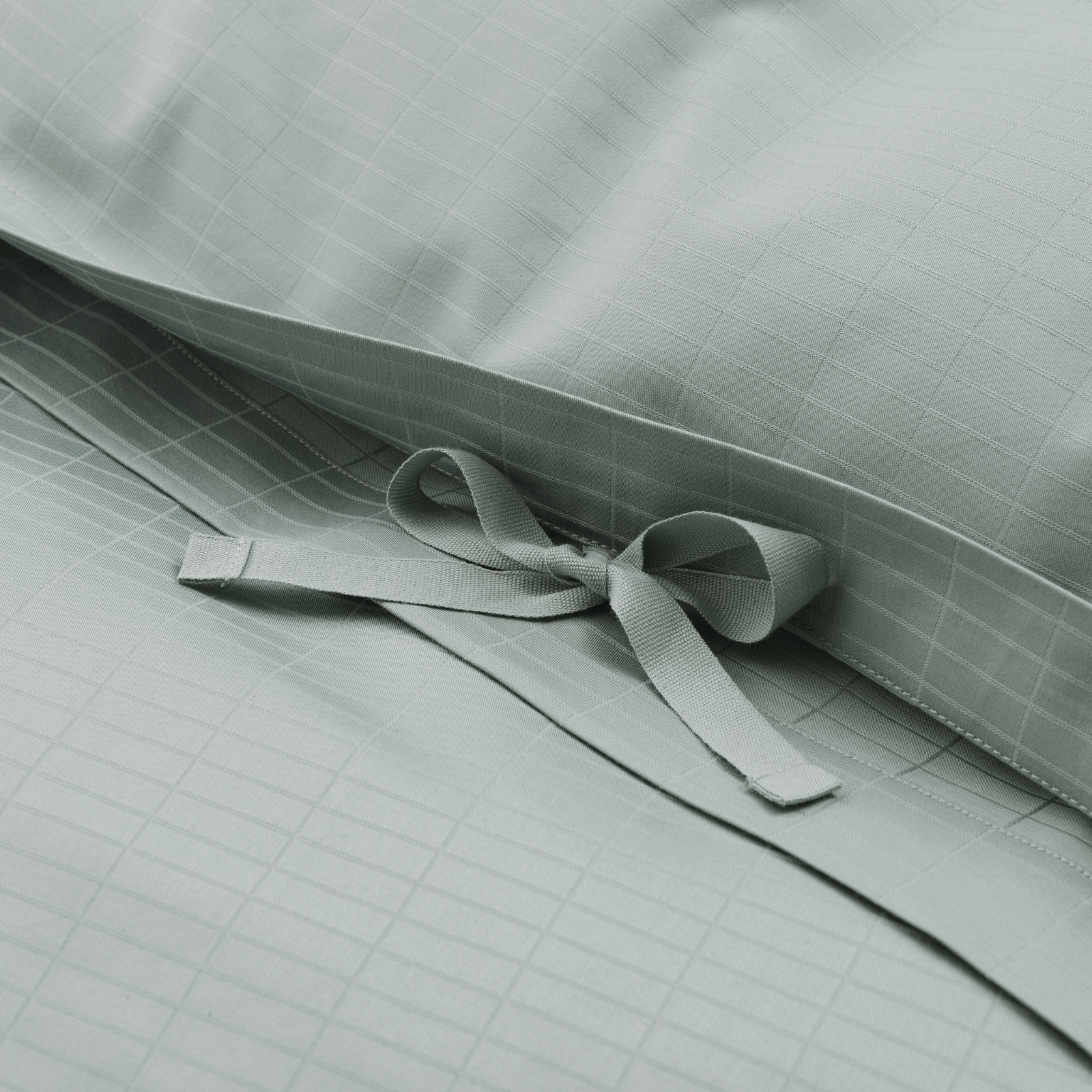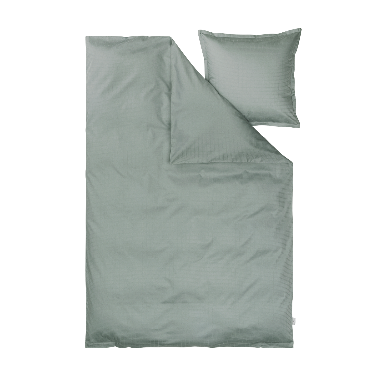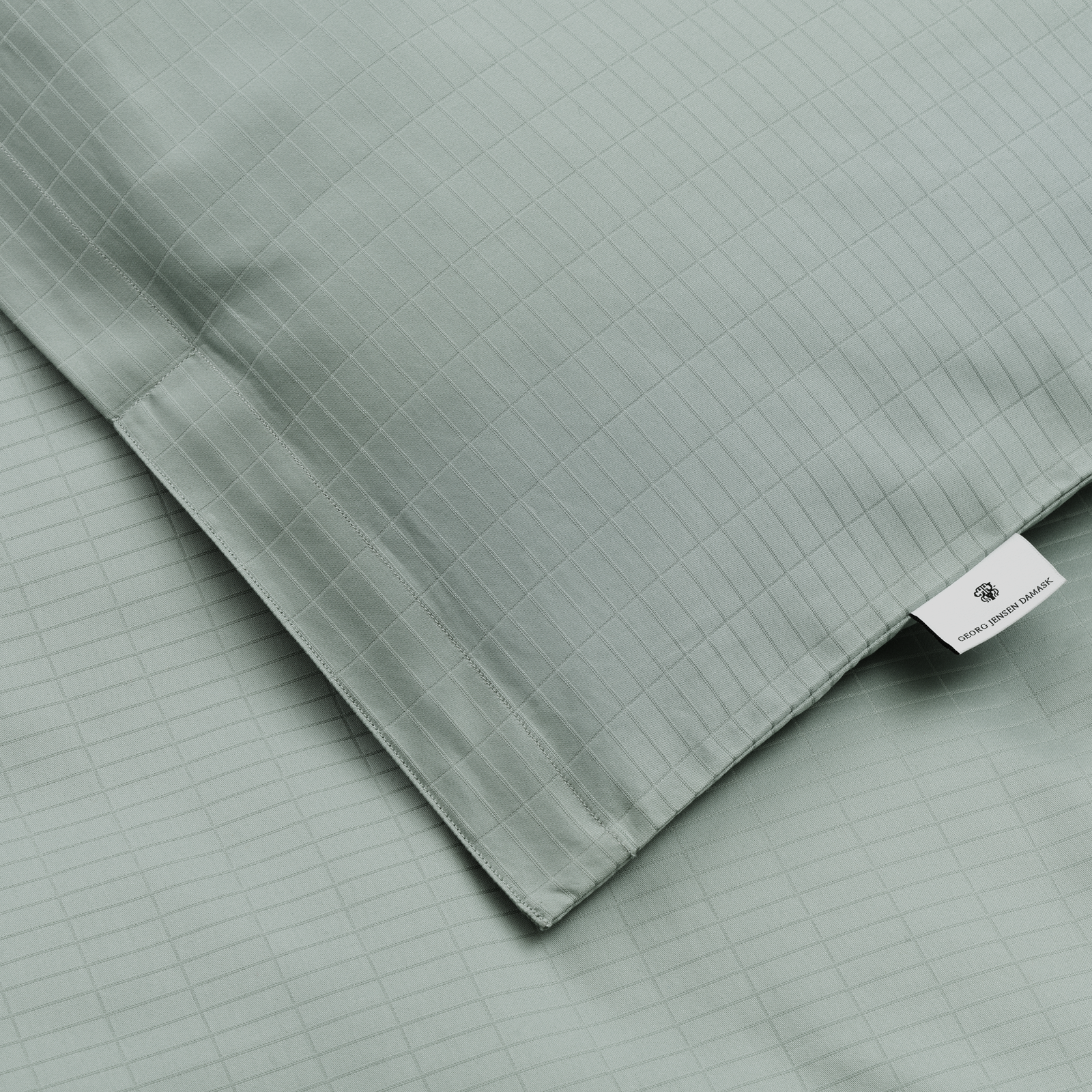 Satinvävt bäddset med ett stramt mönster där horisontella och vertikala linjer bildar rektangulära rutor som elegant framhävs i den blanka väven. Classic Lines‑bäddsetet är vävt i 100 % bomull i en sval grön nyans.