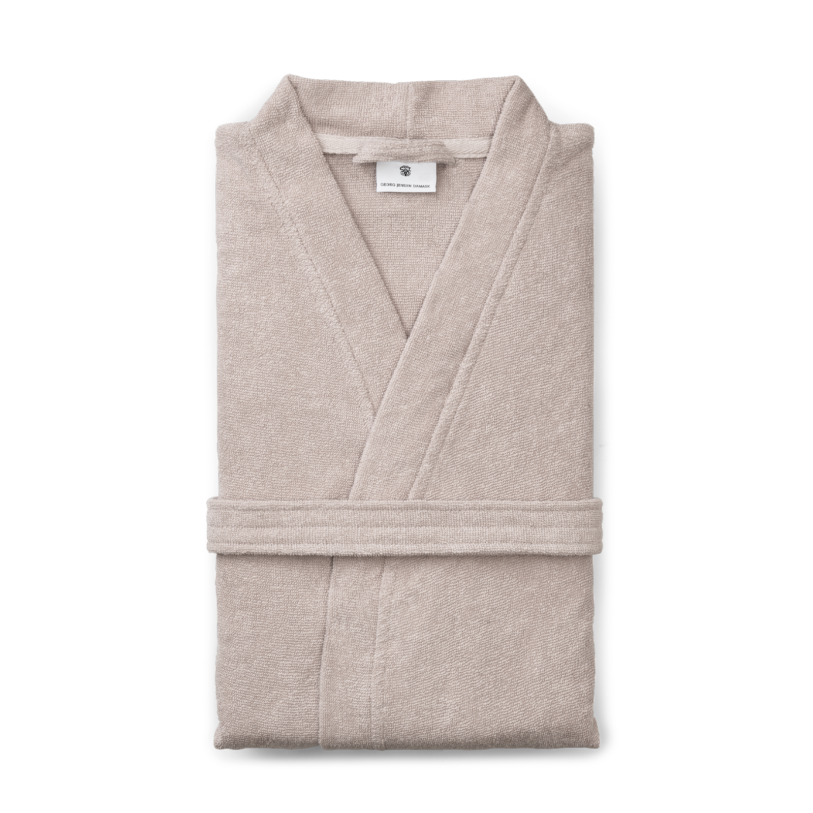 Frottébadrock i en klassisk design med kimonokrage, fickor, knytband i midjan och invändiga sömmar med kantband. Terry‑badrocken är unisex och vävd i 100 % bomull med öglor av dubbeltrådade och kammade garner som ger en vacker och glansfull yta.