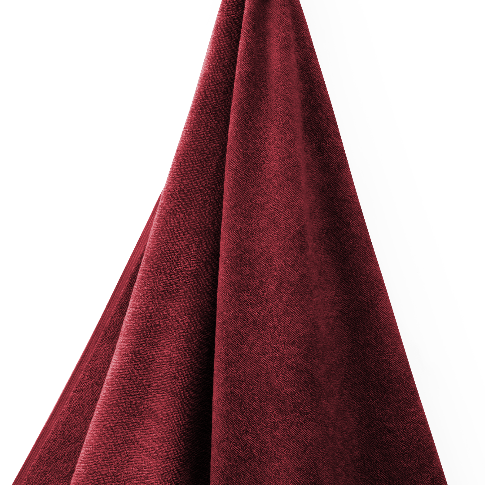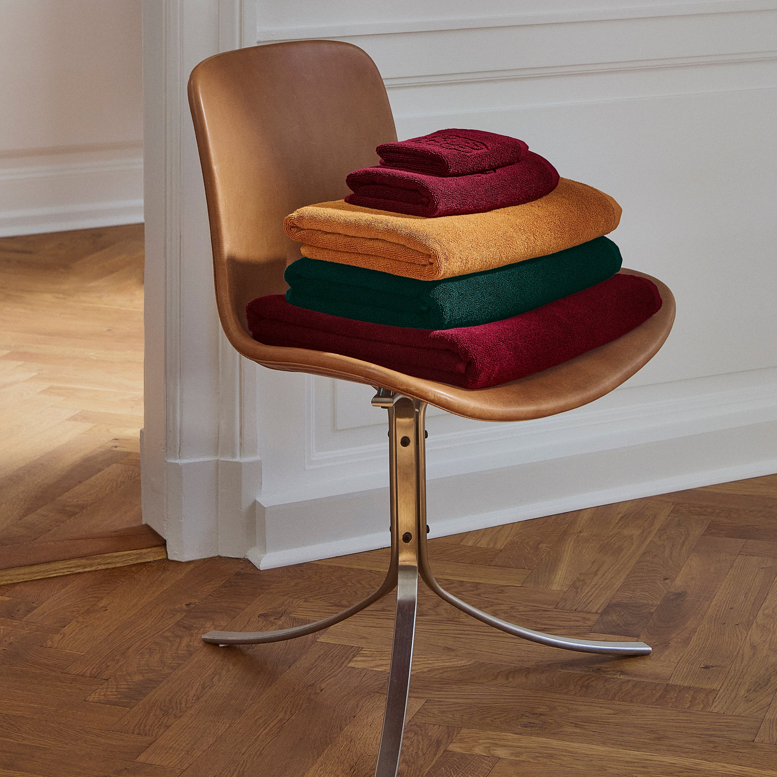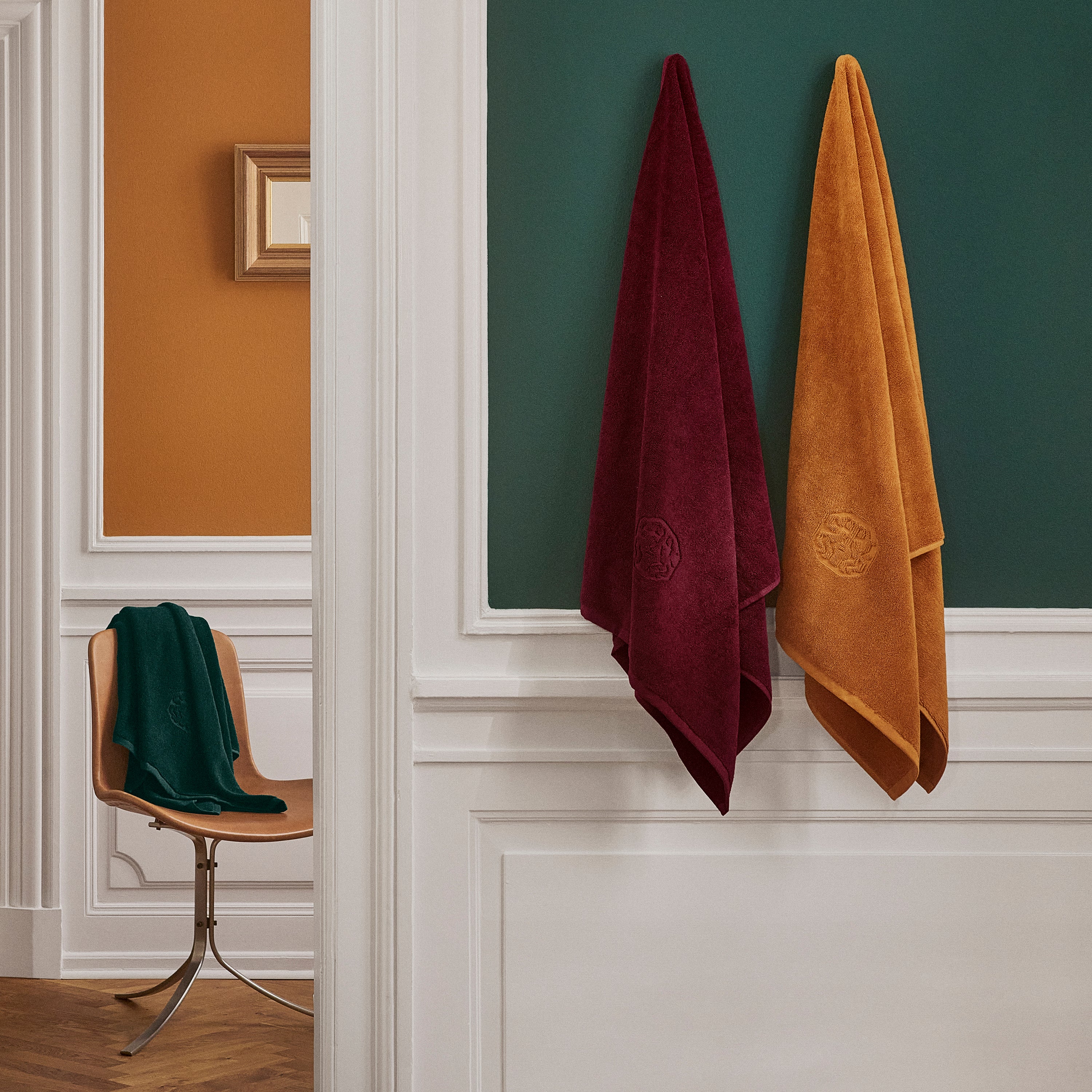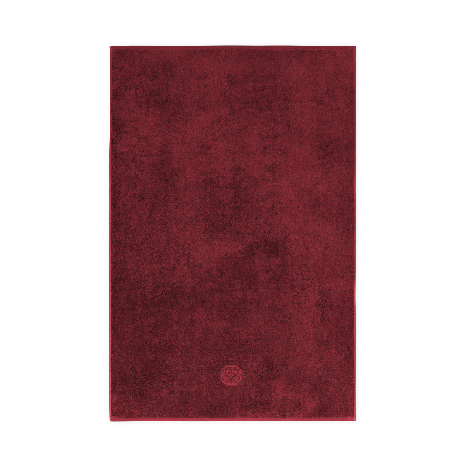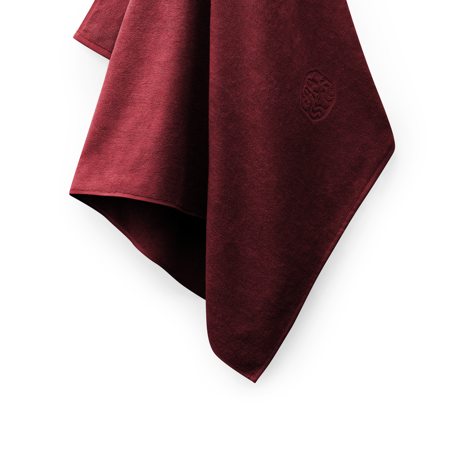 Stort och mjukt Damask Terry-badlakan i färgen Carmine Red – en djup och distingerad röd med en kall underton. Som en elegant detalj har badlakanet Georg Jensen Damasks ikoniska invävda logotyp.