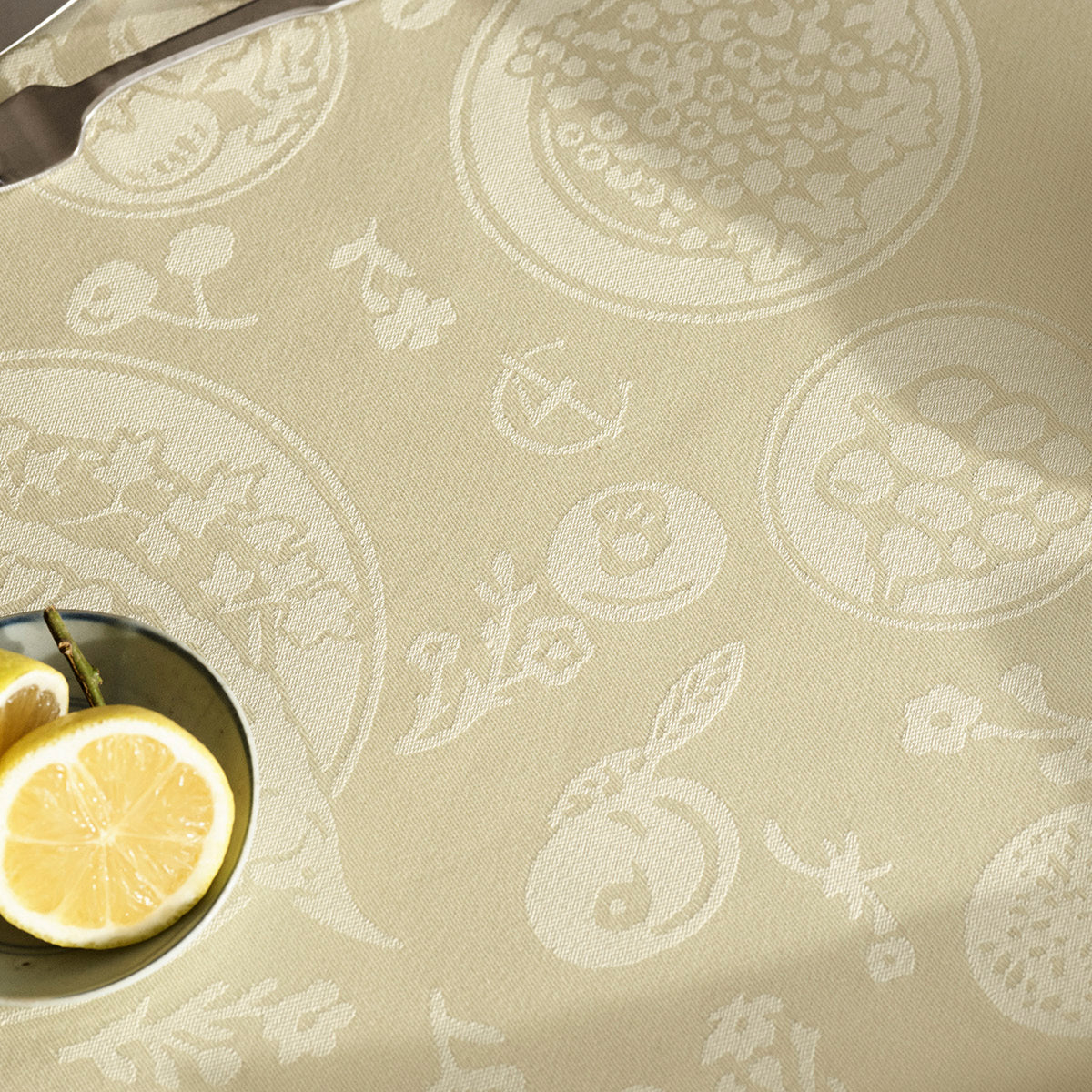 Banquet är en elegant damastvävd duk med en design som bygger på element från renässansmåltiden. Duken har ett invävt Christian IV-monogram som en historisk referens och är vävd i 100 % dubbeltvinnad kammad bomull. Den finns två färger. Pale Yellow är en fin ljusgul nyans.