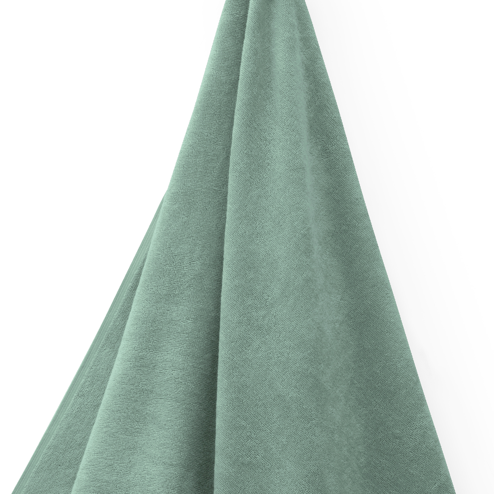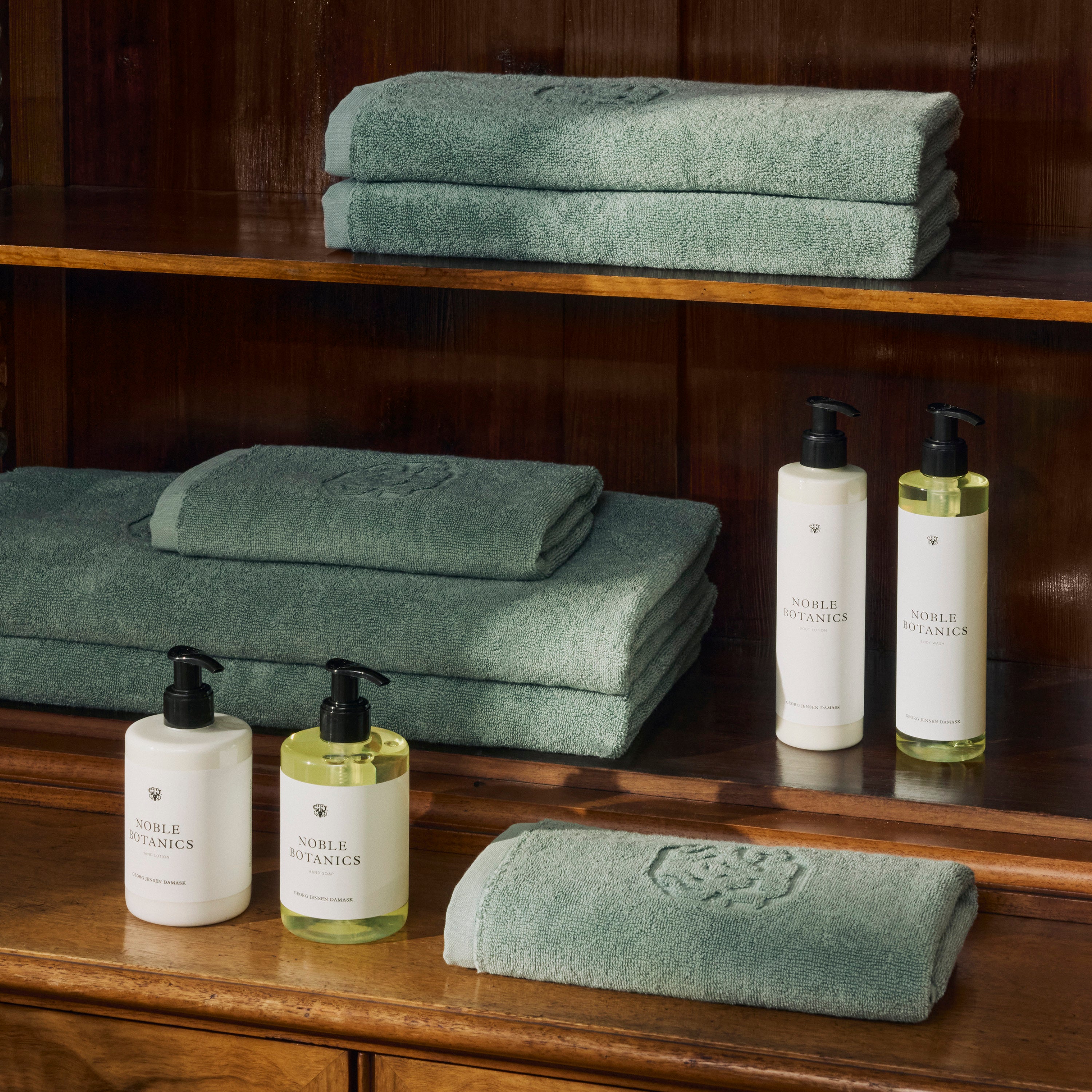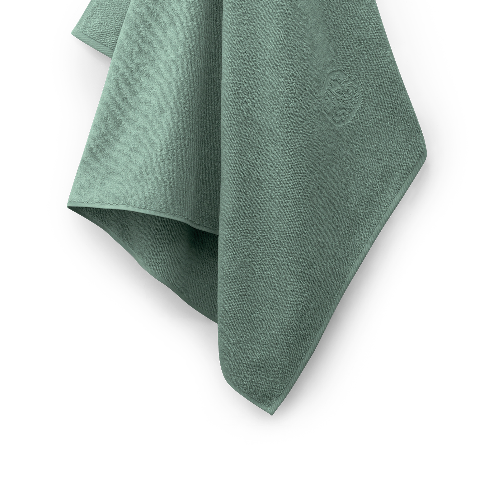 Stort och mjukt Damask Terry badlakan i färgen Sage Green – Sage Green är en kall nyans av grönt. Som en elegant detalj har badlakanet Georg Jensen Damasks ikoniska logotyp invävd.