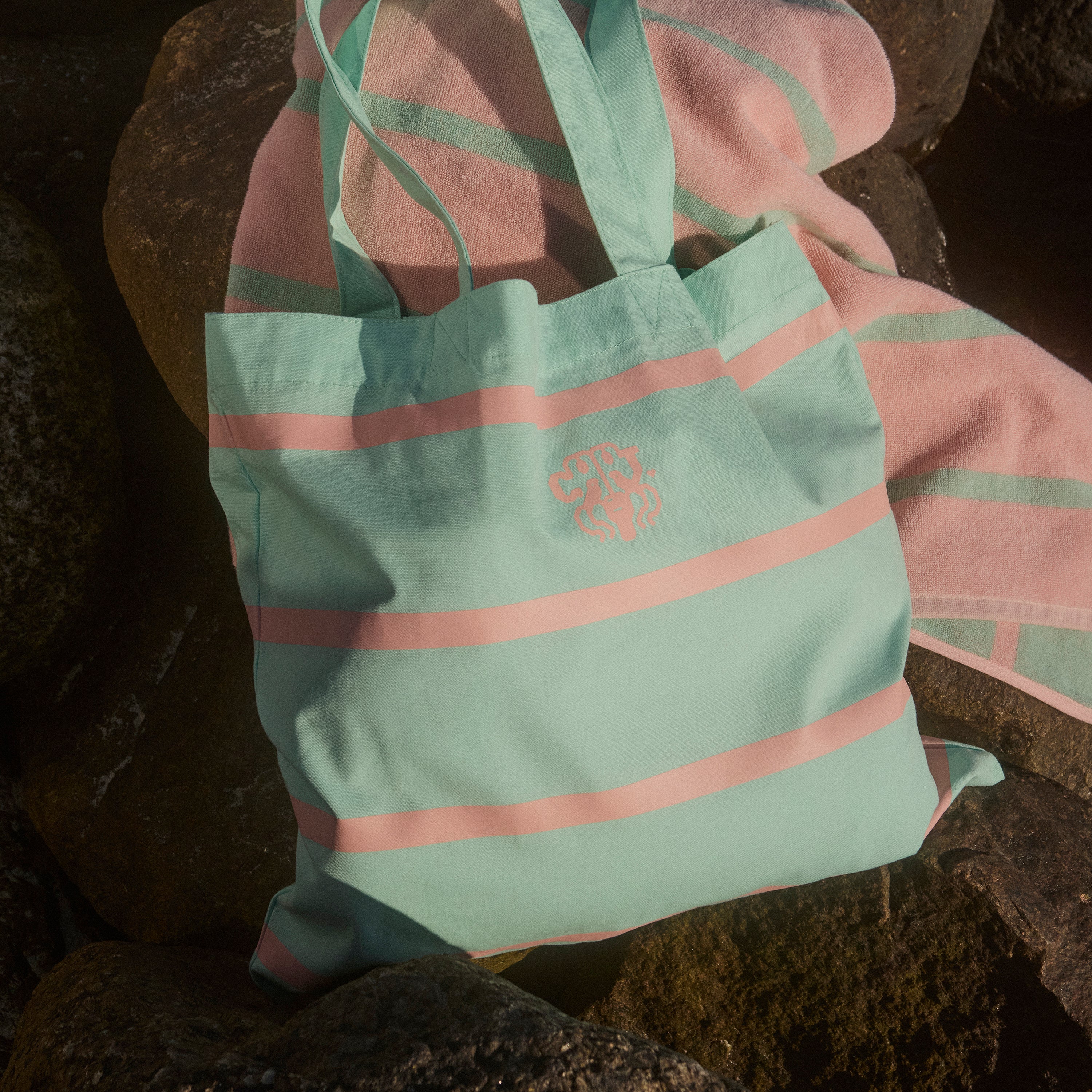 Canvasväska i fräscha somriga nyanser. Den rymliga väskan är vävd i 100 % bomull och är perfekt för strandutflykten. Färgen Summer Rose är grön med ljusa rosafärgade ränder.