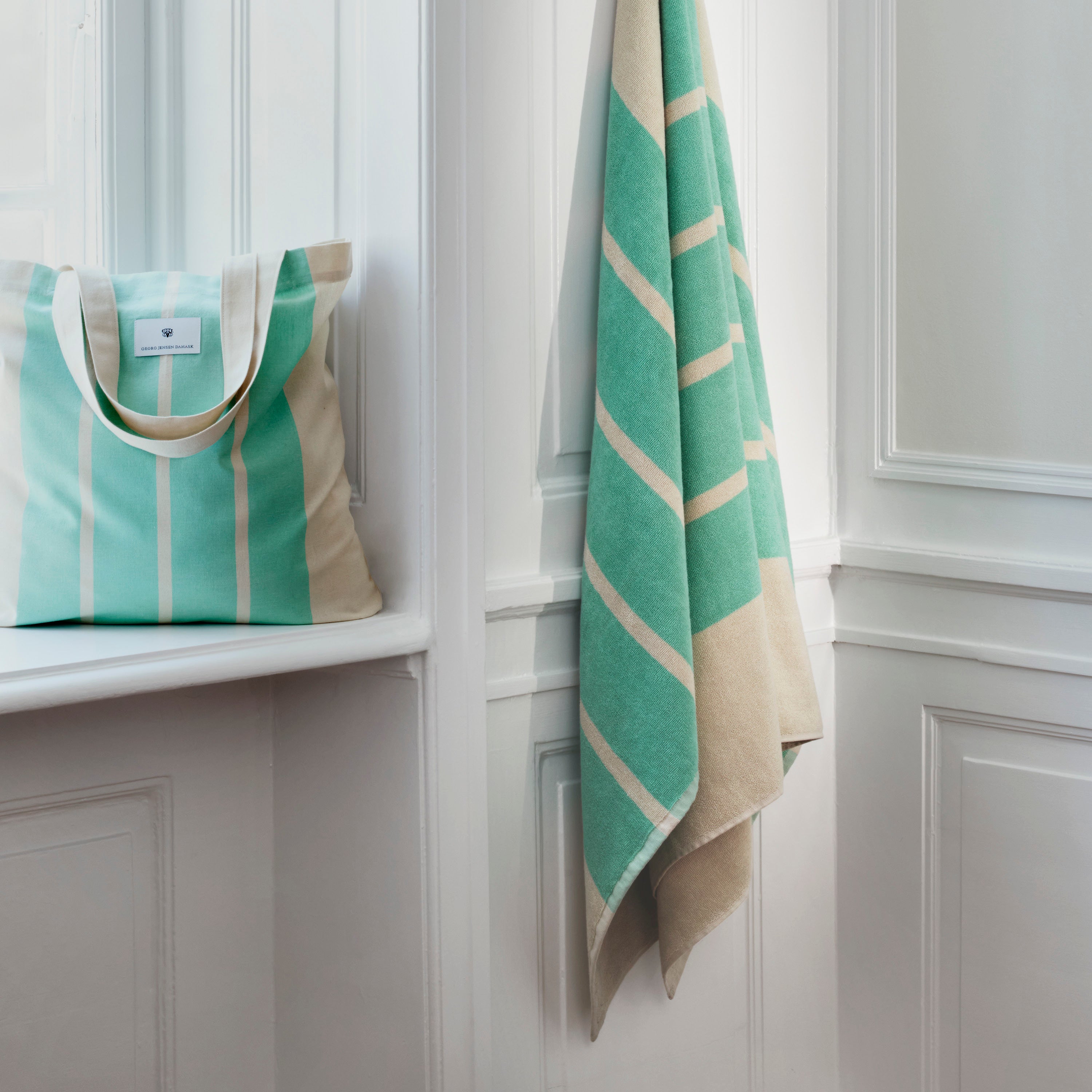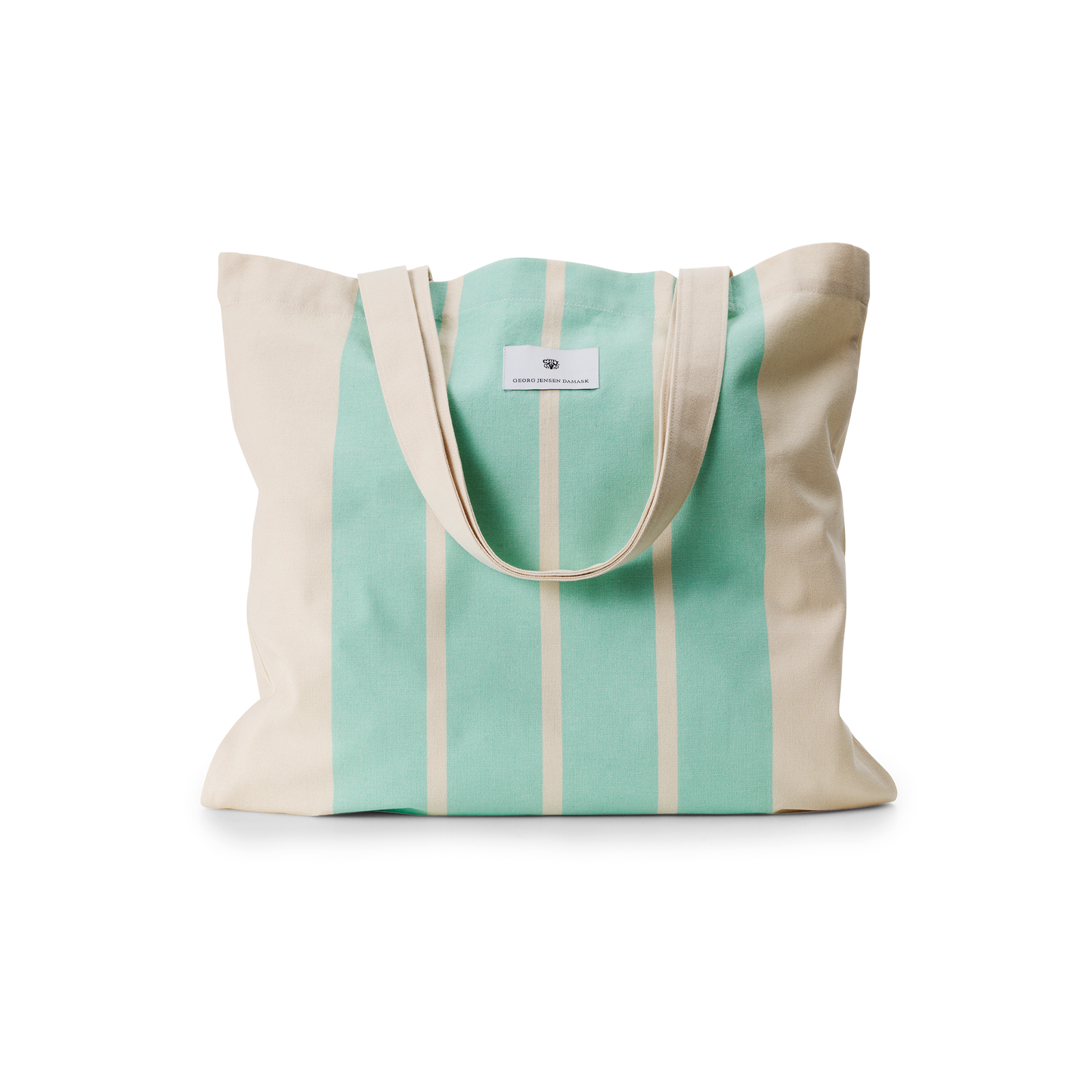 Rymlig canvasväska vävd i 100 % bomull med gröna ränder på en sandfärgad botten.