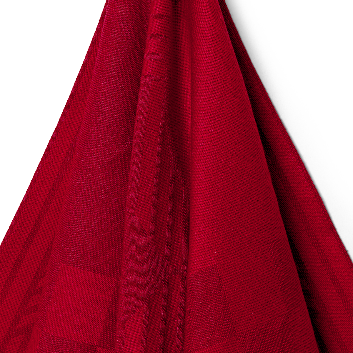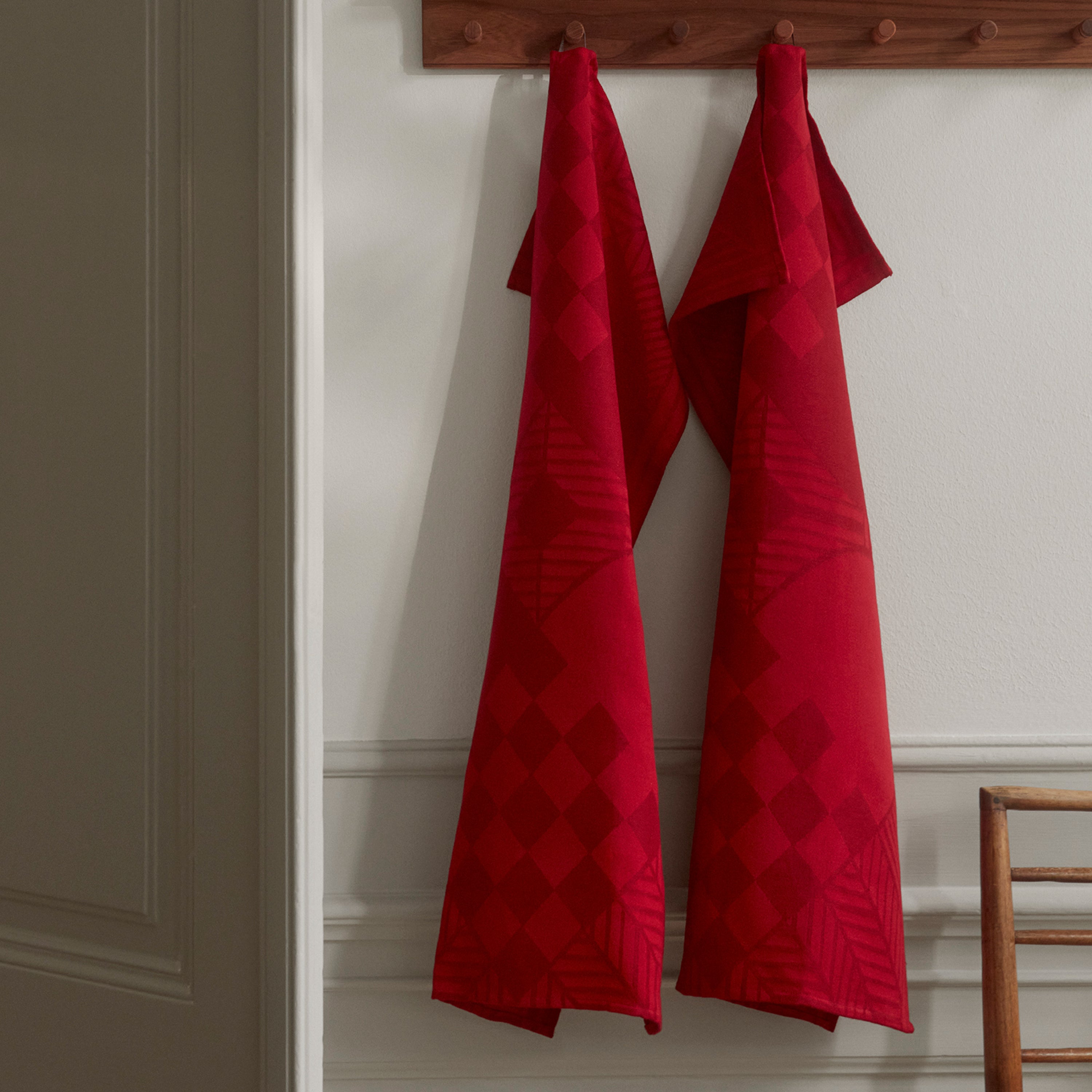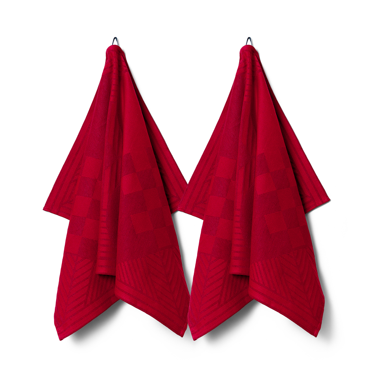 Den röda juldiskhandduken Deep Red med mönster av Bodil Bødtker-Næss är en favorit i Georg Jensens Damasks kollektion. Den är vävd i en blandning av linne och bomull som gör den praktisk att använda och snygg att ha framme i köket. Två juldiskhanddukar i ett set är den perfekta gå bort-presenten.