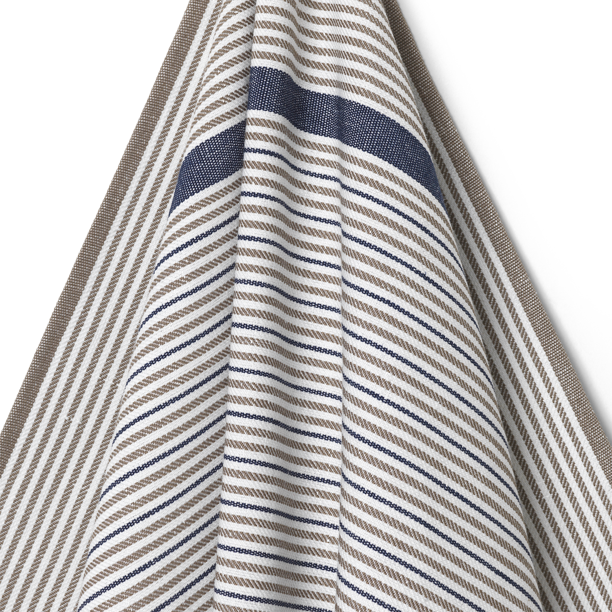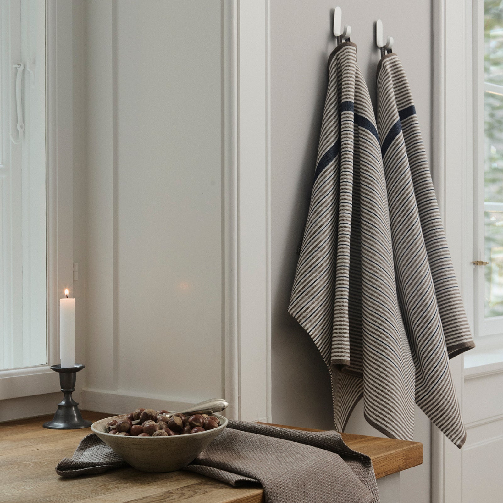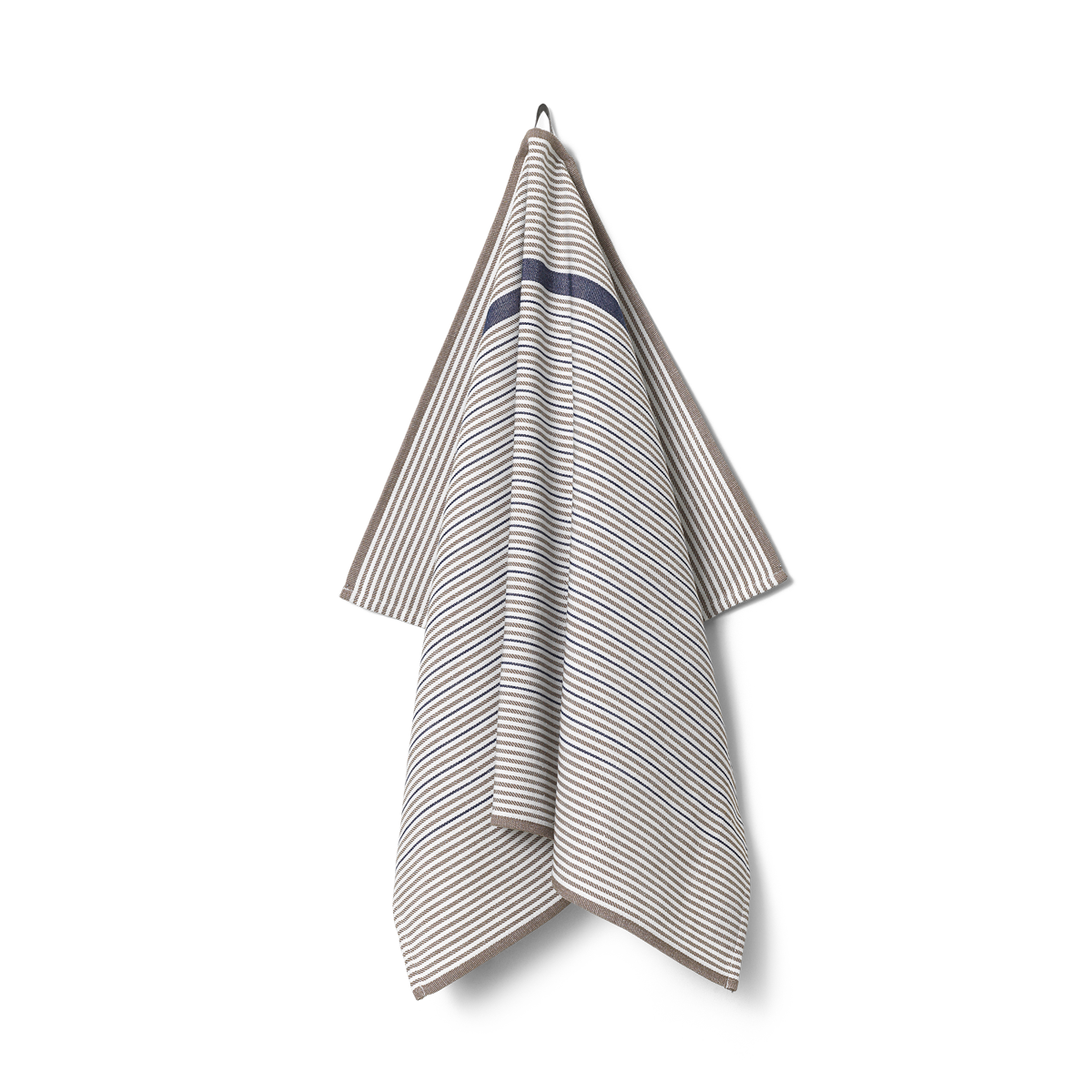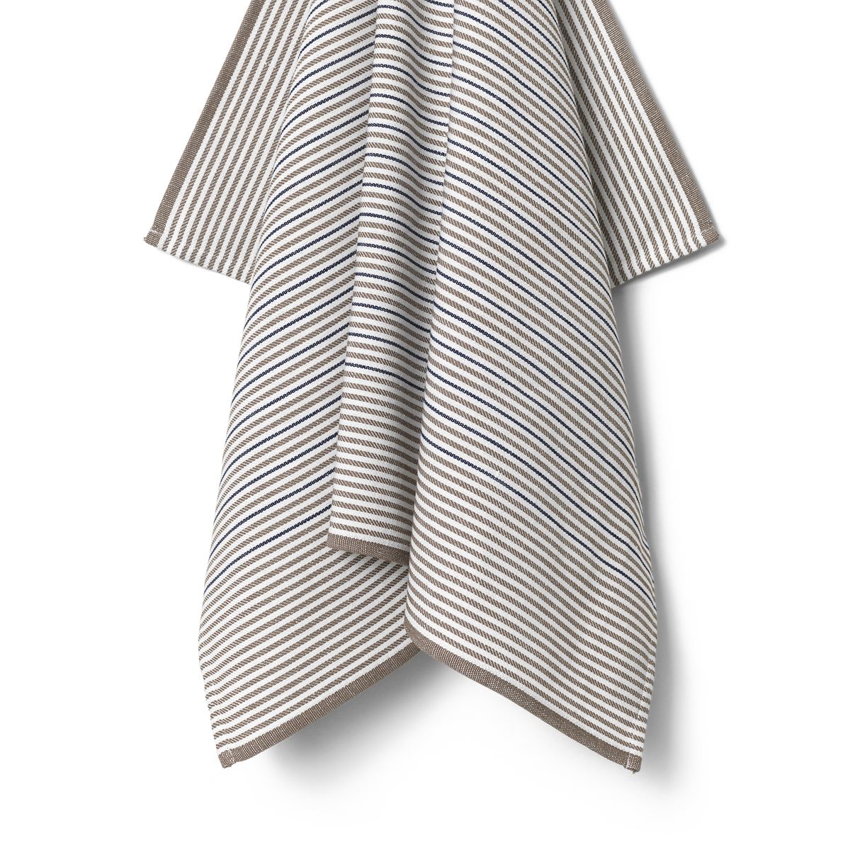 Comet är en stilren randig diskhandduk designad 1979 av Bent Georg Jensen. Diskhandduken är vävd i en blandning av bomull och linne som gör den perfekt att torka med. I färgvarianten Walnut blandas en blå rand med en mörk, nötbrun nyans.