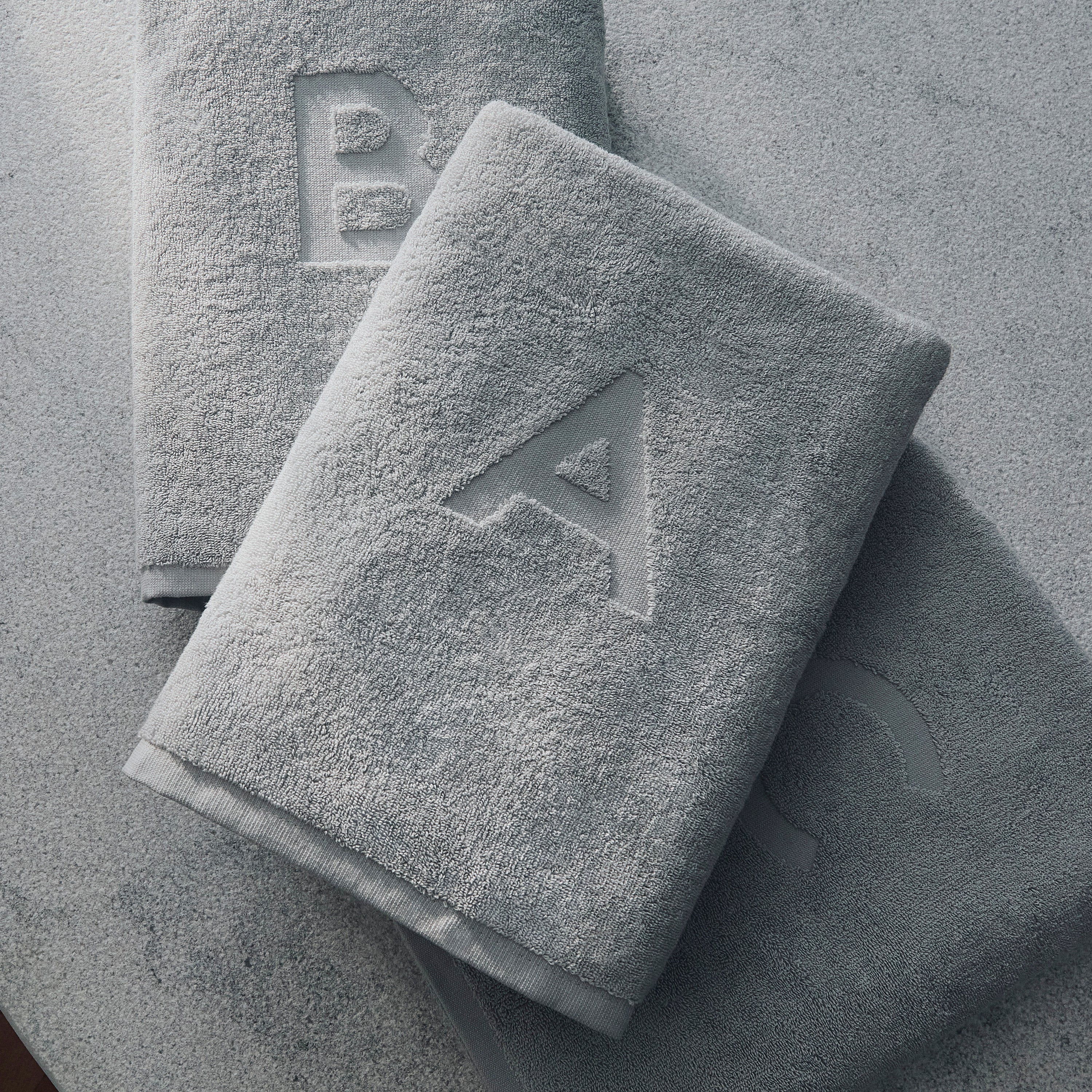 Damask Terry-badhandduk med invävt I. Badhandduken är jacquardvävd i 100 % dubbelspunnen, kammad bomull med bokstaven i relief. Den är både mjuk, glansig och slitstark. Den eleganta färgen Platinum Grey är en ljus och sval grå nyans.