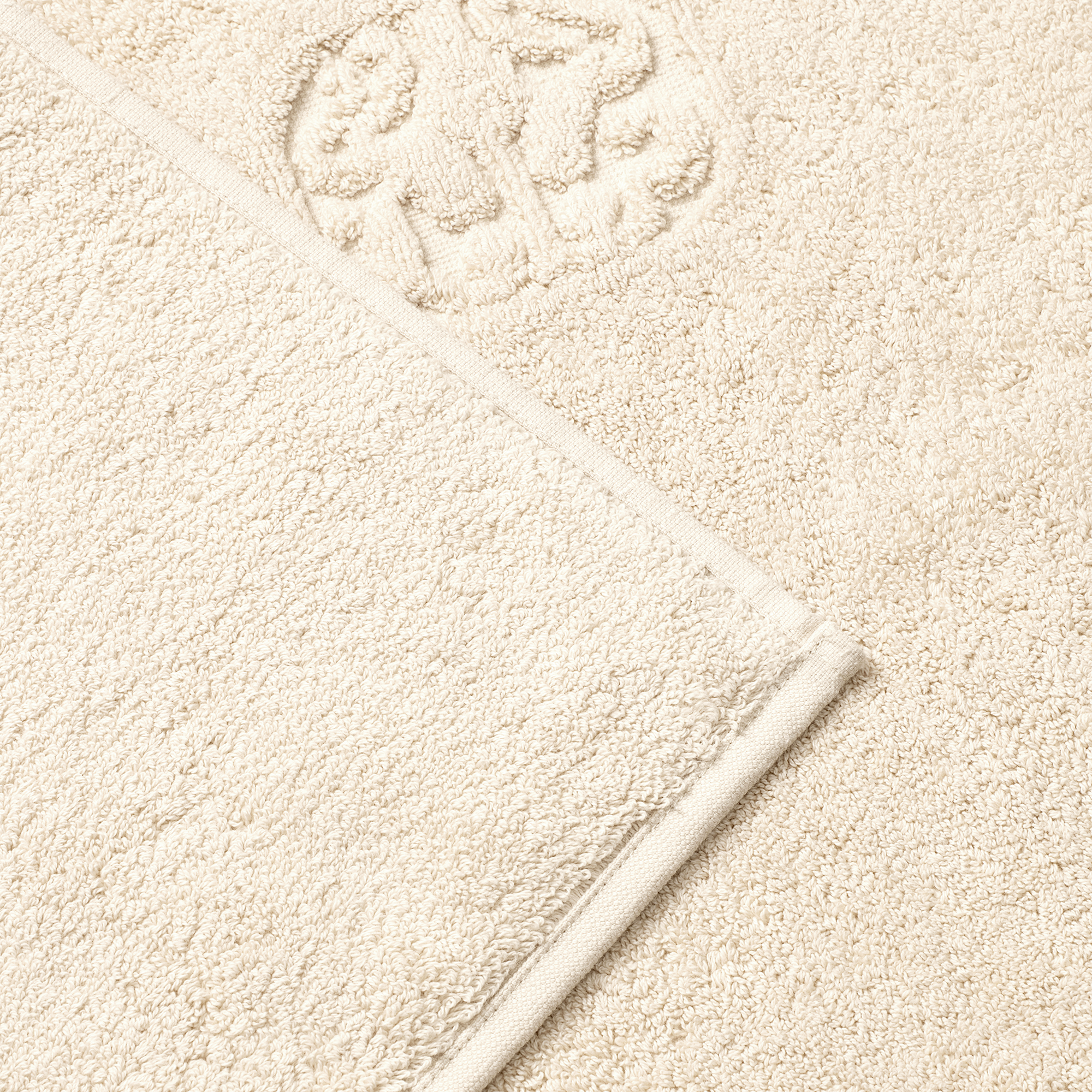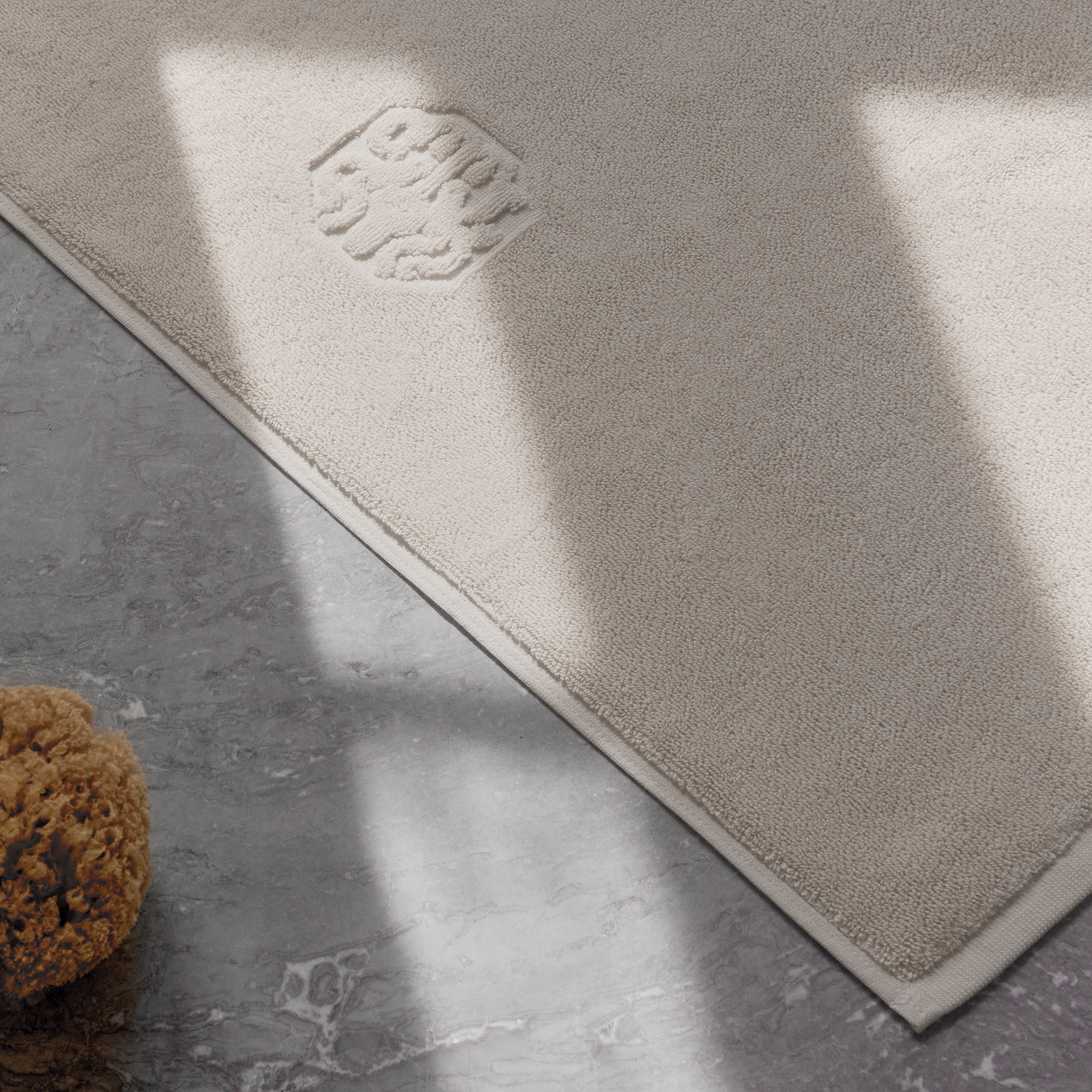 Damask Terry badrumsmattan har ett enkelt uttryck med Georg Jensen Damasks ikoniska logotyp invävd som en elegant detalj. Archive Linen är en ljus beige färg med referenser till linne från vårt hundraåriga arkiv.