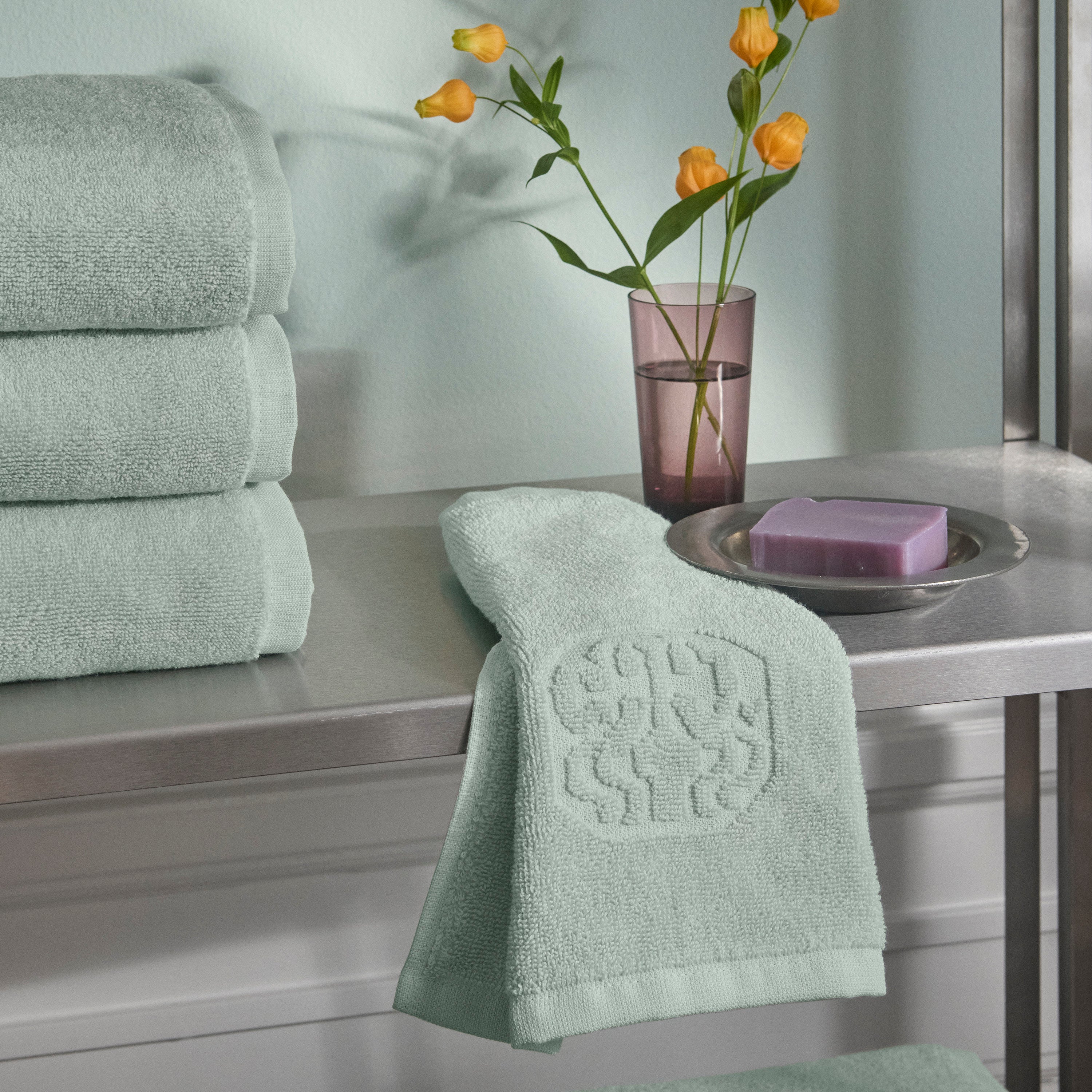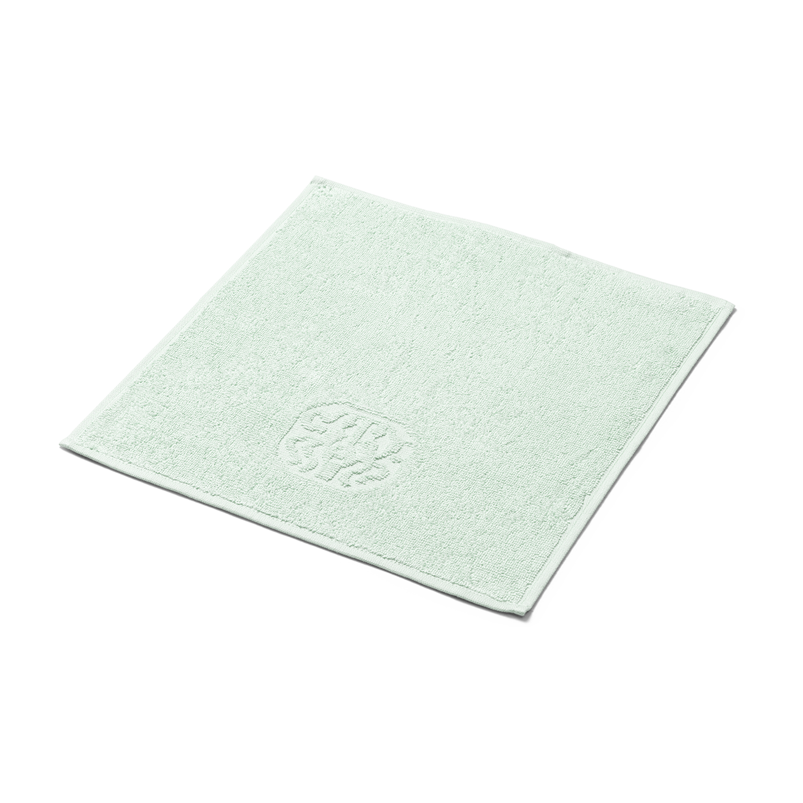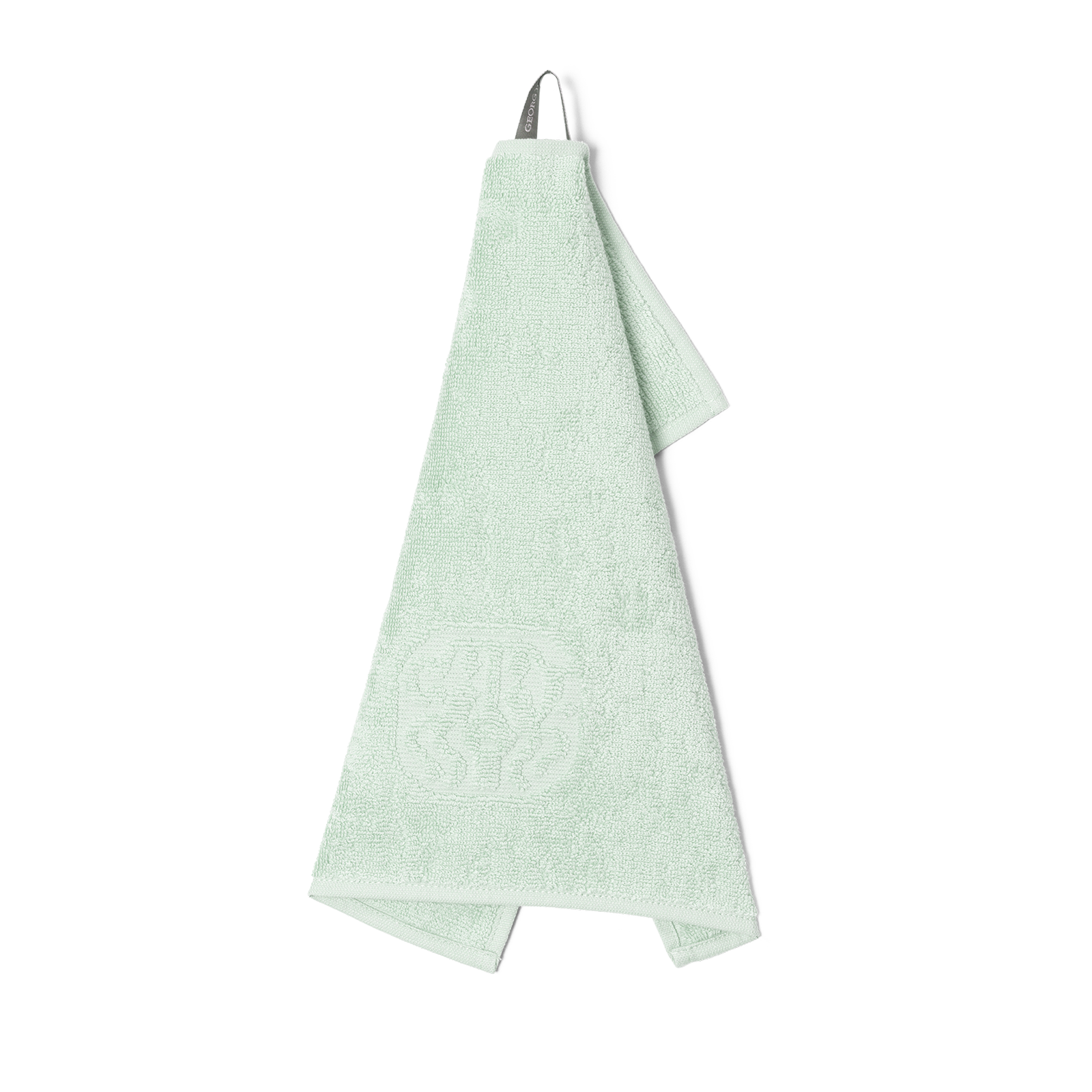 Damask Terry tvättlappen har ett enkelt uttryck med Georg Jensen Damasks ikoniska logotyp invävd som en elegant detalj. Den klara grönblå nyansen, Glass Green, är inspirerad av färgen på råglas.