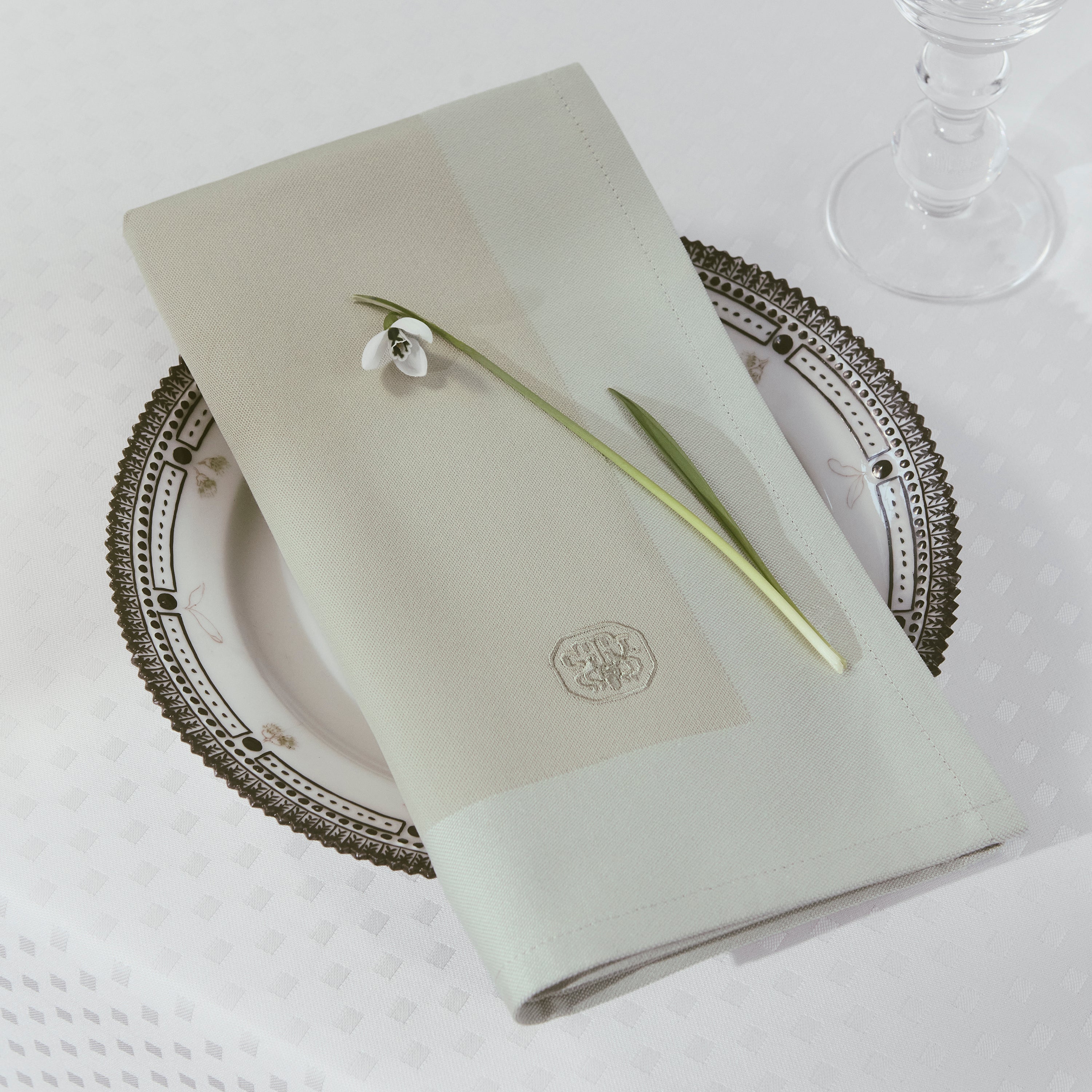 Vår klassiska servett har en vackert broderad logotyp. Den klassiska damastvävda servetten är ett vackert inslag i dukningen. Med sin enkla design och sitt tidlösa uttryck passar den för alla tillfällen. Servetten är vävd av 100 % bomull och har en karaktäristisk kant i en ljusare nyans.