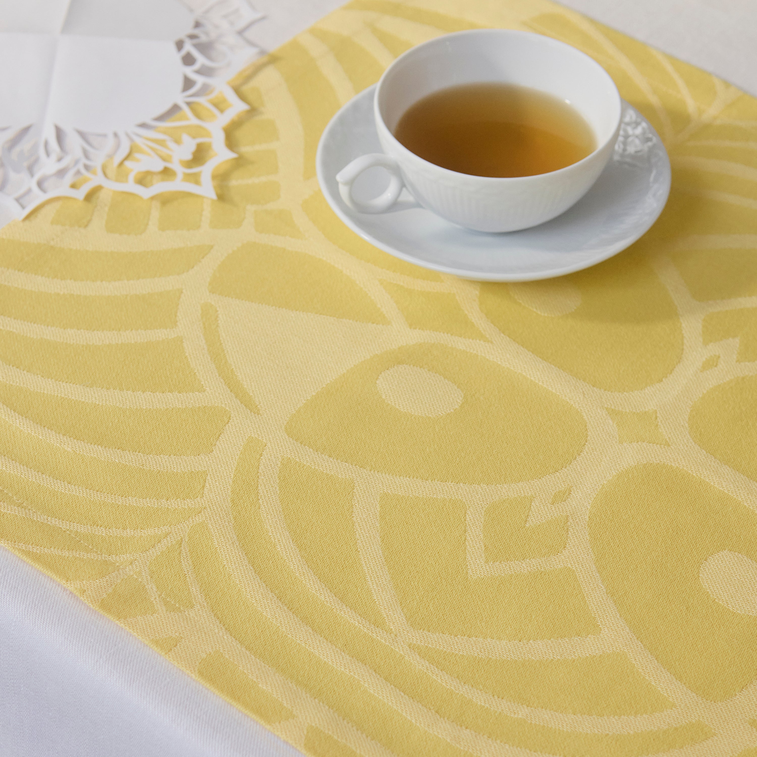 Den kraftiga damastväven i 50 % lin och 50 % bomull ger bordstabletterna ett rustikt utseende som gör dem lite mer informella, men är dock inte mindre vackra att duka med i påsktider.