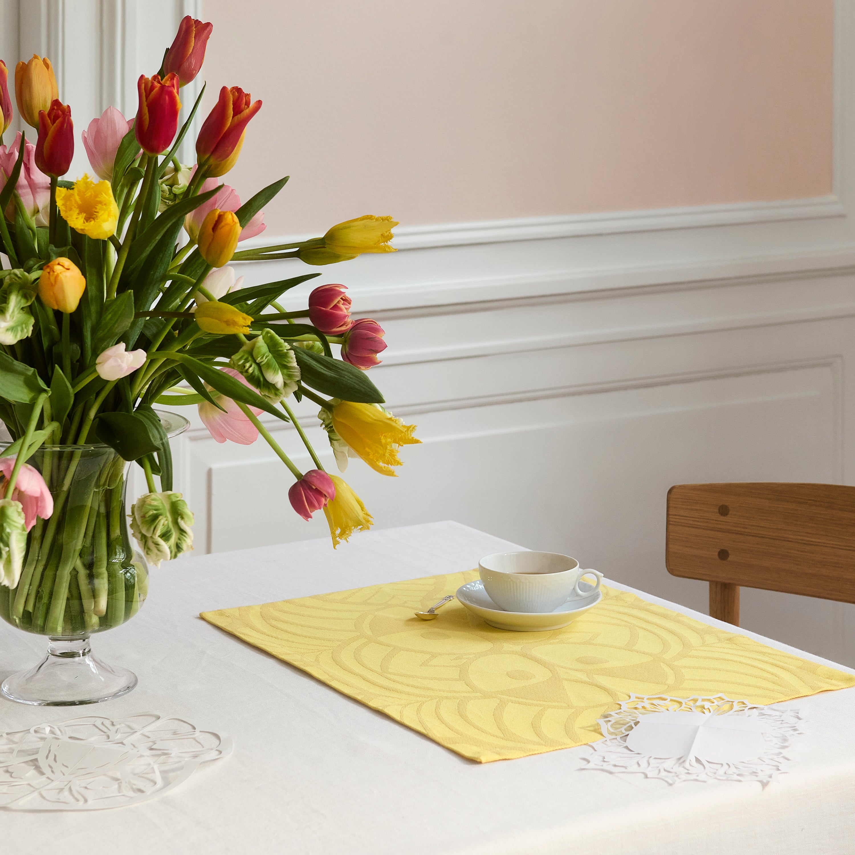 Den kraftiga damastväven i 50 % lin och 50 % bomull ger bordstabletterna ett rustikt utseende som gör dem lite mer informella, men är dock inte mindre vackra att duka med i påsktider.