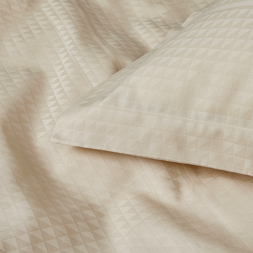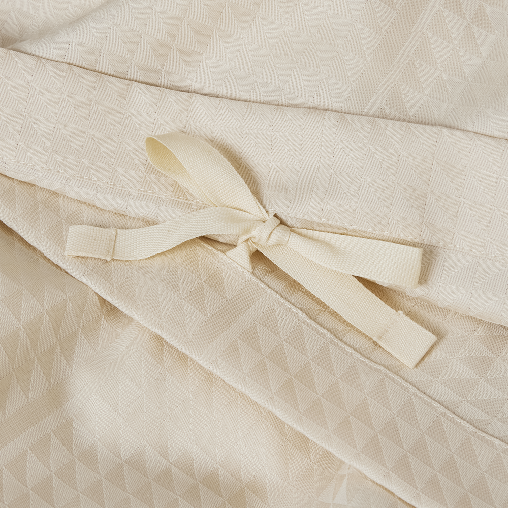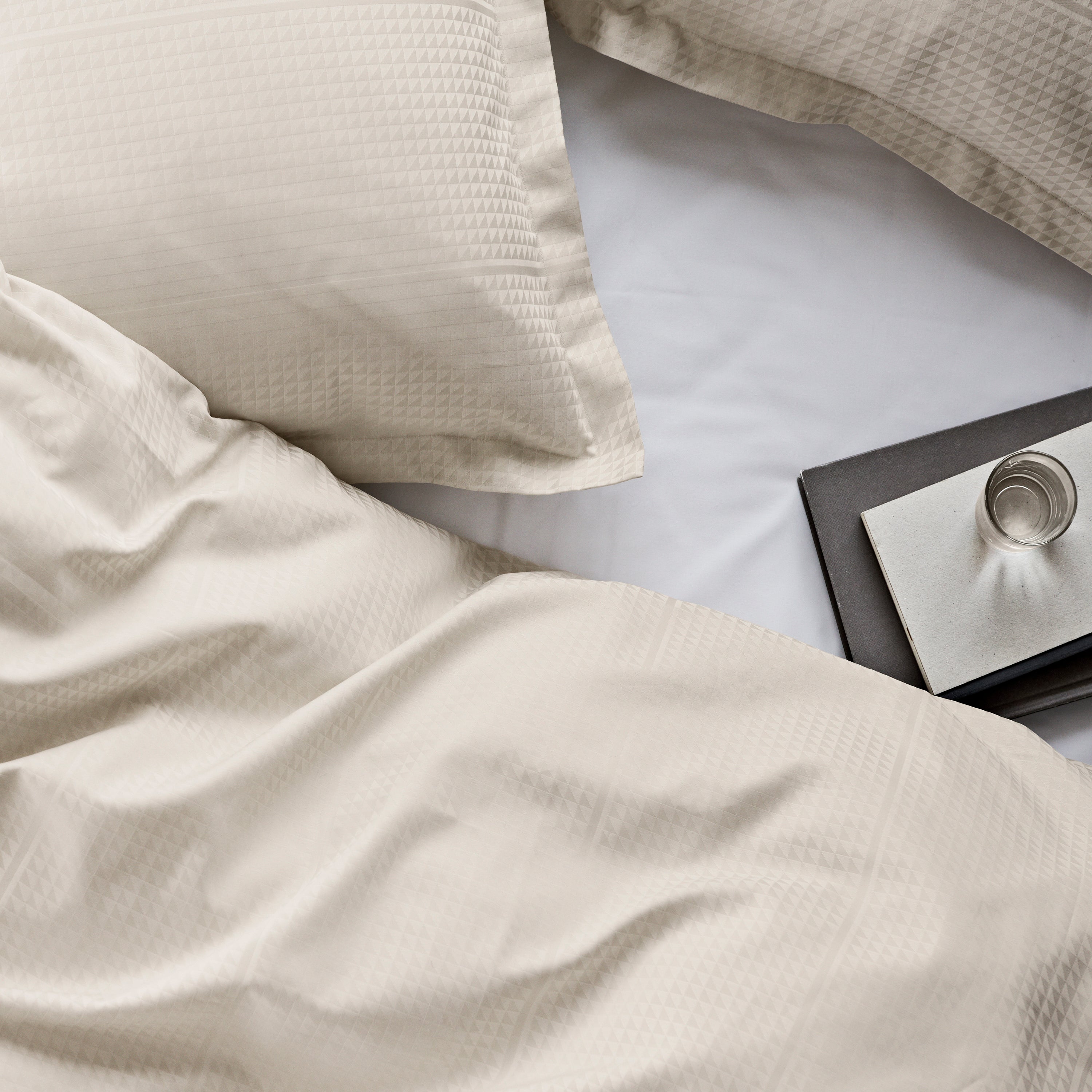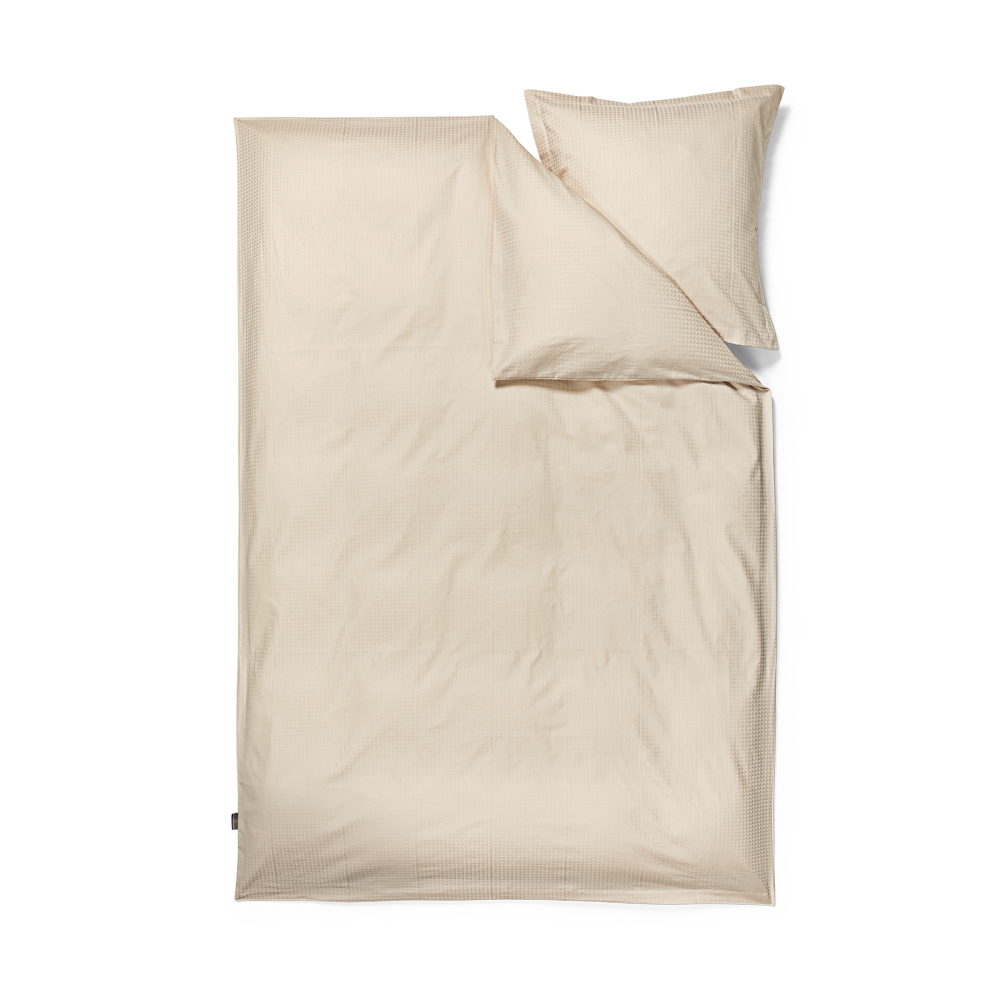 Georg Jensen Damasks Facet-påslakan har en strikt design och är damastvävd i 100 % kammad bomull, vilket ger en mjuk och slät yta. Med Facet-designen använder textilkonstnären Jette Nevers den klassiska damastvävningen för att skapa ett elegant ljus- och skuggspel, som framhävs vackert i den ljusbeige färgen Archive.