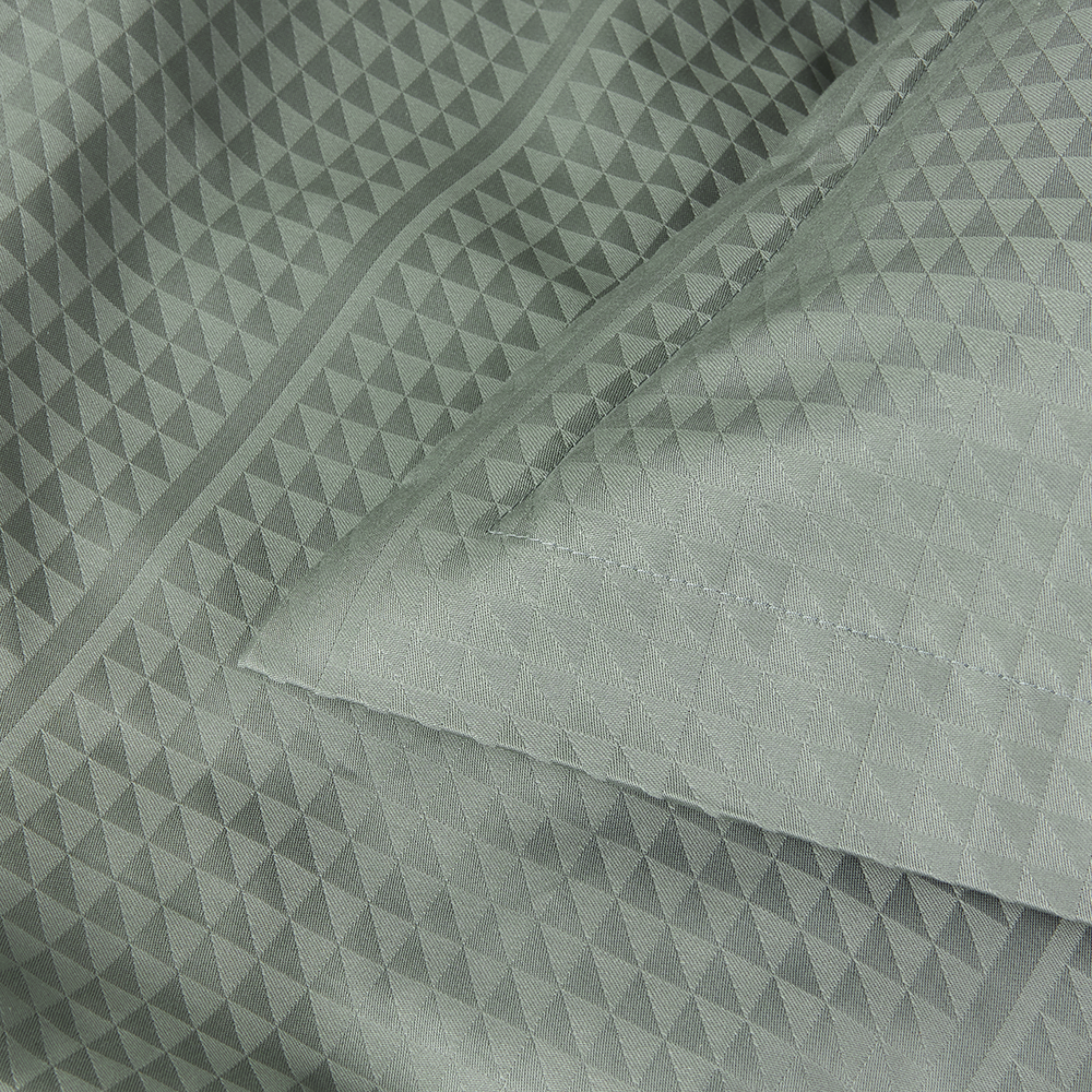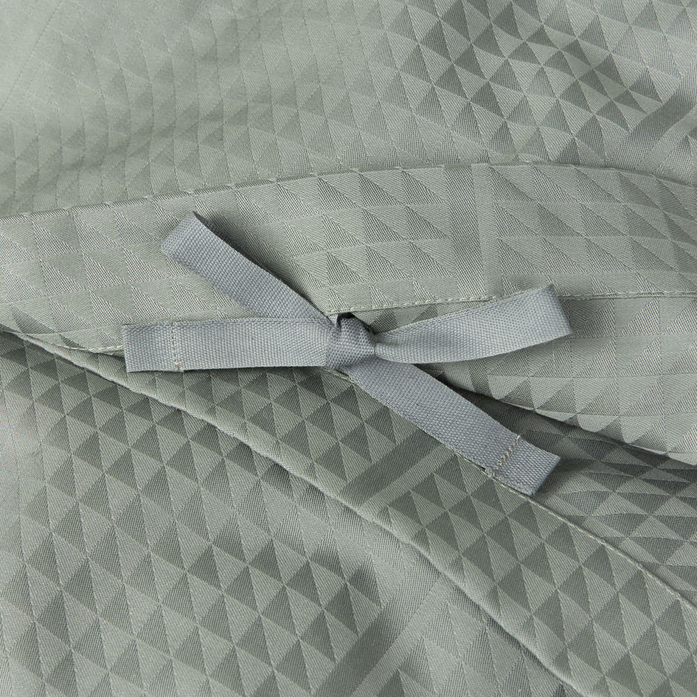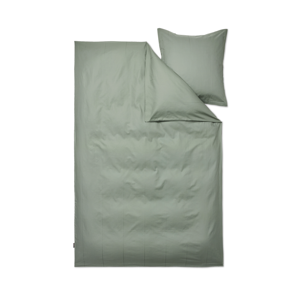 Georg Jensen Damasks Facet-påslakan har en strikt design och är damastvävd i 100 % kammad bomull, vilket ger en mjuk och slät yta. Med Facet-designen använder textilkonstnären Jette Nevers den klassiska damastvävningen för att skapa ett elegant ljus- och skuggspel, som framhävs vackert i den mörkgröna färgen Mineral Green.